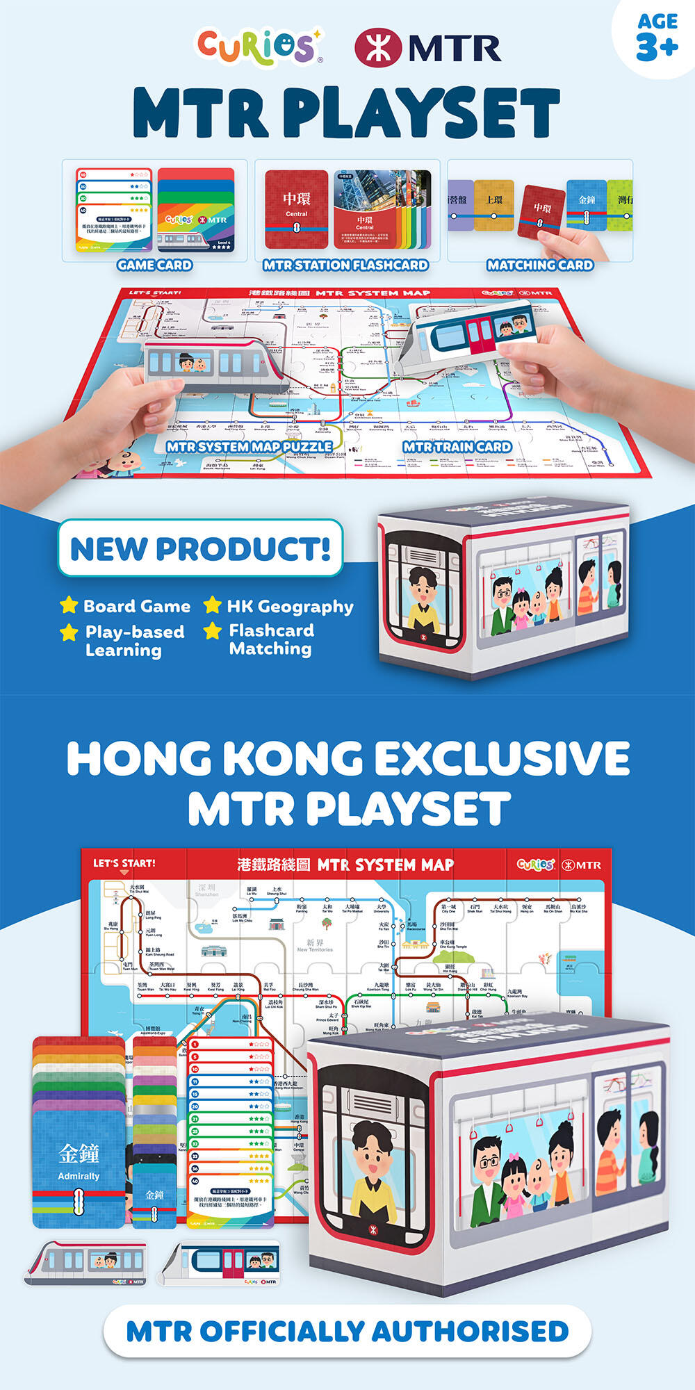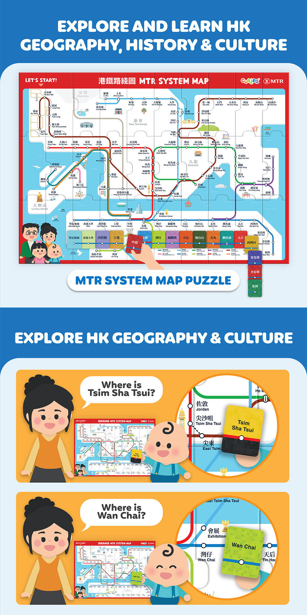 MTR Playset features a variety of games, including an MTR system map jigsaw puzzle, trivia quiz on local geography and MTR, and a card matching game where the players have to associate MTR stations with corresponding landmarks and stories