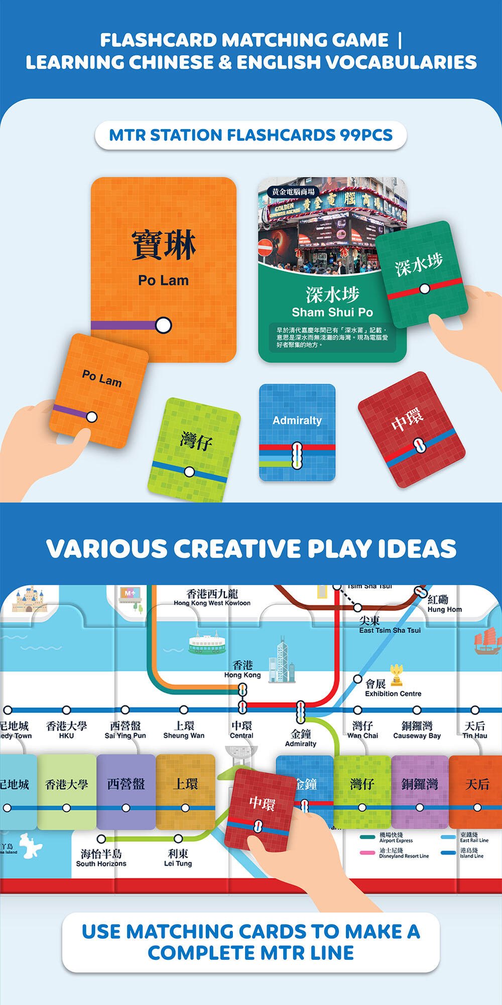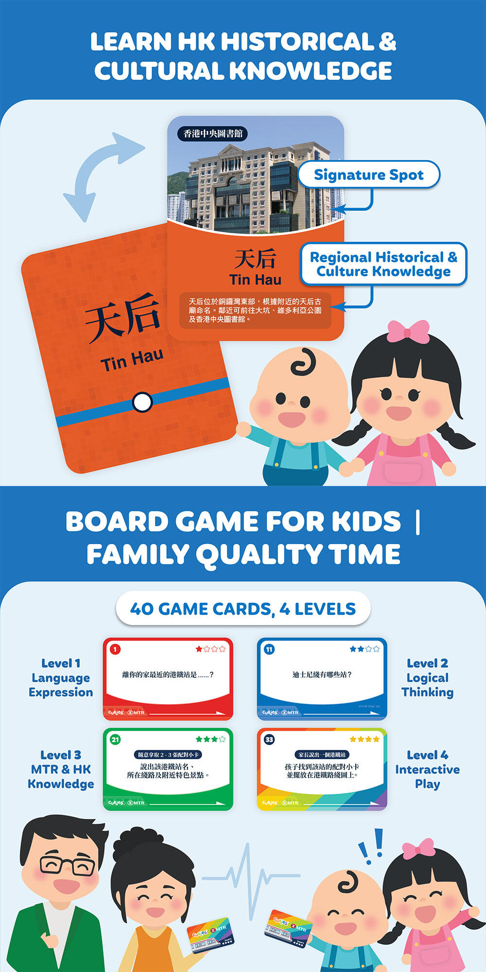 • HK Knowledge Play: Each MTR Station Flashcard contains informative description & simple historical story for players to remember and recognize the geo place, with a tourist attraction or a favourite family to-go spot during weekend.