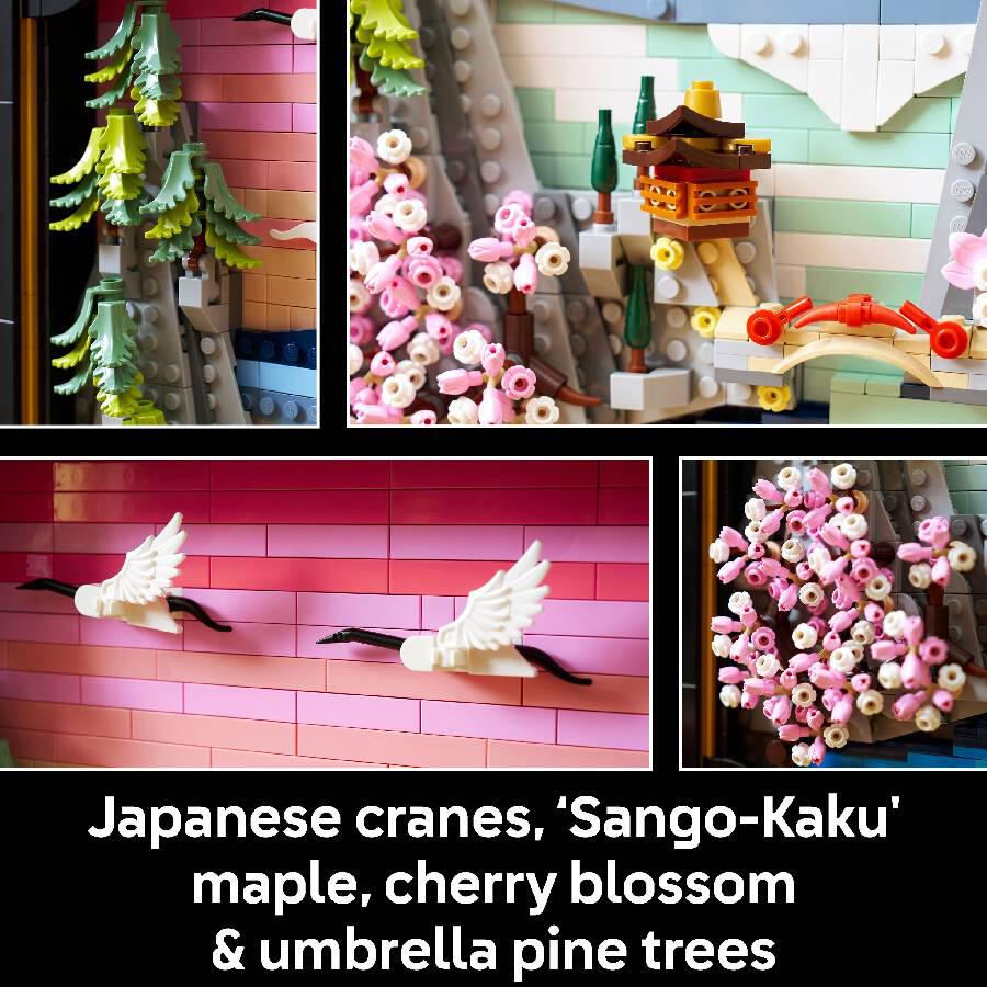 - HOMAGE TO JAPAN – This LEGO reimagination of a traditional Japanese landscape features Mount Fuji, a teahouse, Japanese cranes and ‘Sango-Kaku’ maple, cherry blossom and Japanese umbrella pine trees.