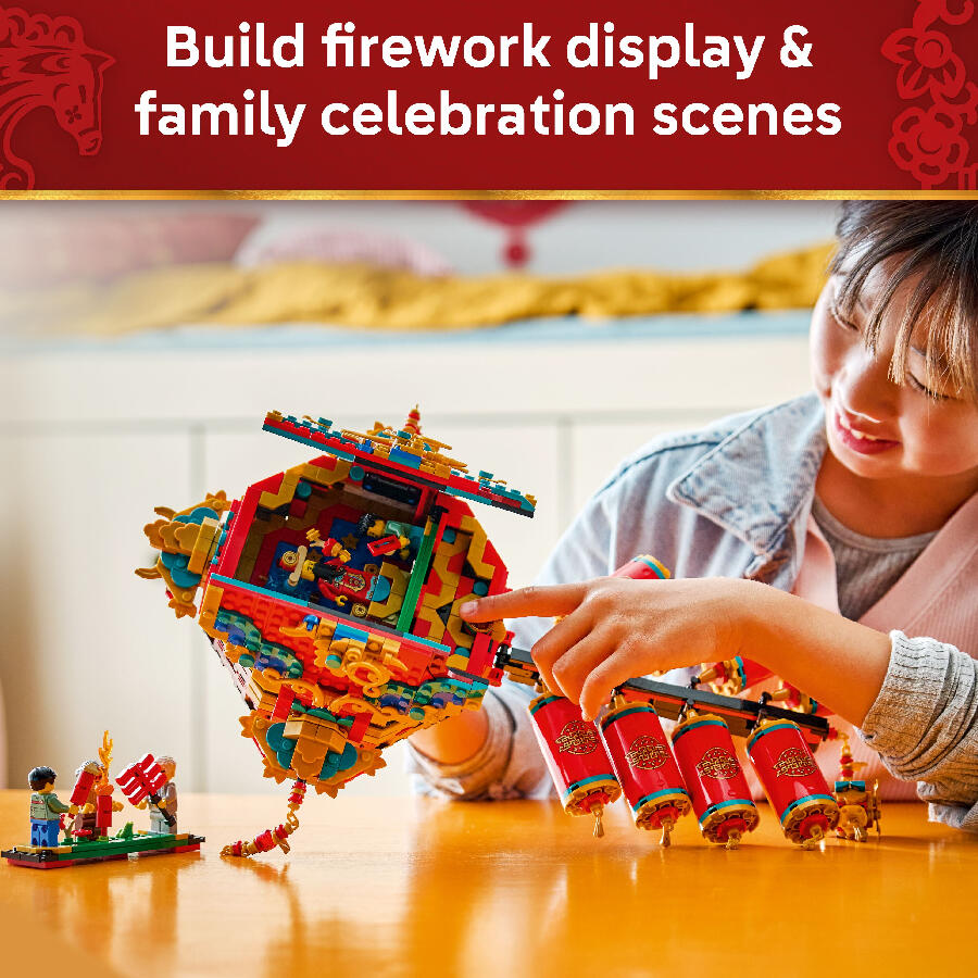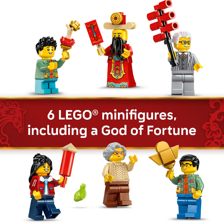 - 6 MINIFIGURES FOR ROLE PLAY – Bring the Spring Festival scenes to life with 2 grandparents, 1 adult, 2 children and a God of Fortune minifigure, and hear the firecrackers ‘crackle’ when they are moved.