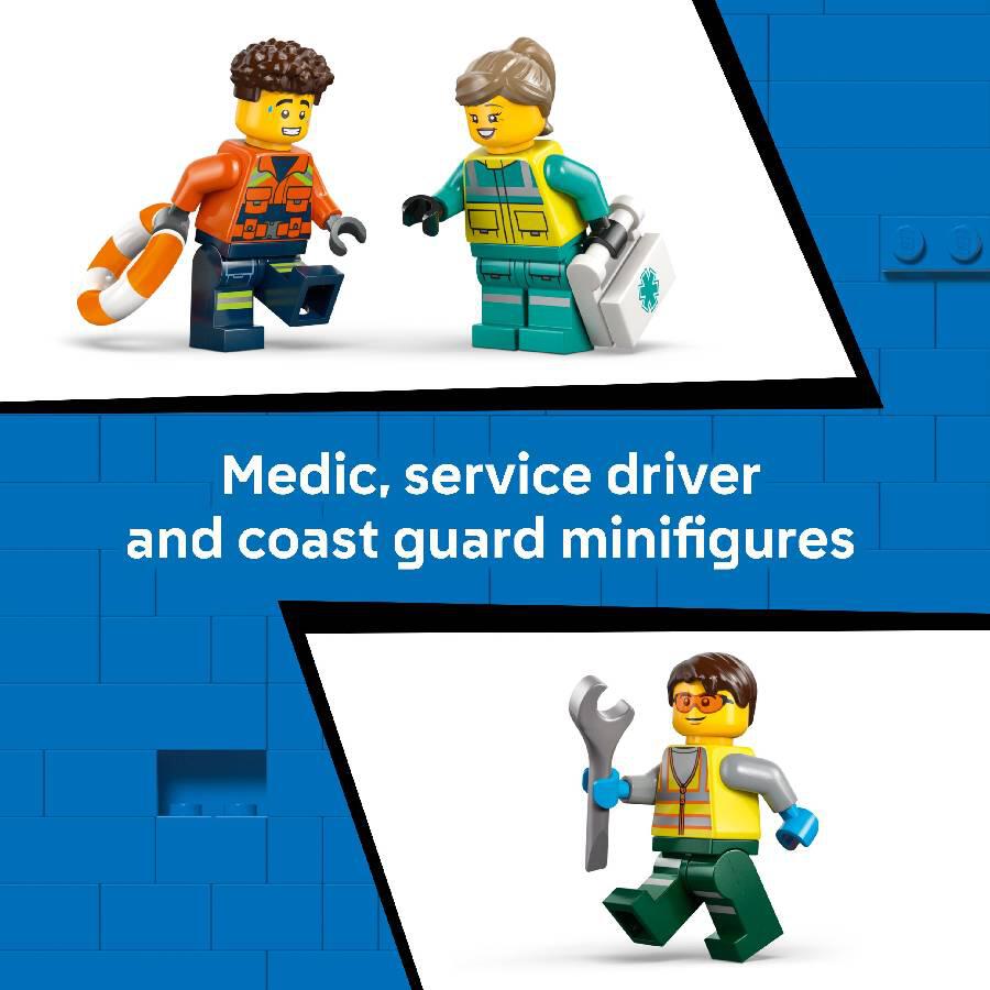 - INCLUDES 3 ICONIC VEHICLES – This model building kit includes a LEGO City medical plane, coast guard hovercraft and service truck, plus medic, coast guard and mountain rescuer minifigures.