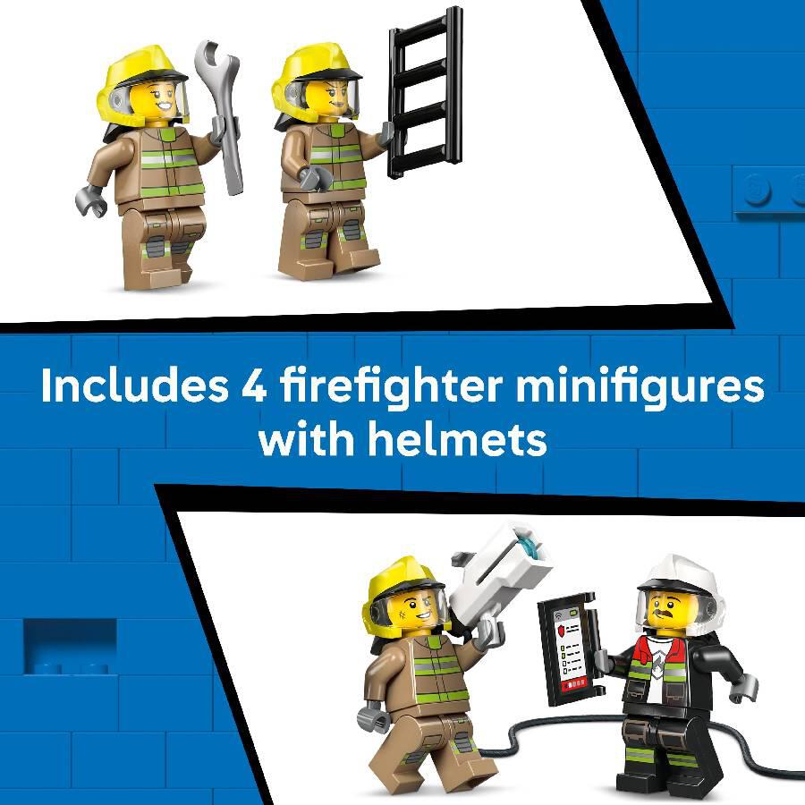 - HANDS-ON FIRE RESCUE ACTION – Kids can turn a dial to steer the toy truck, seat the 4 LEGO firefighter minifigures in the detailed cockpit and launch water elements from the extinguisher.