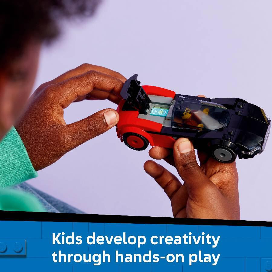 - JUST LIKE THE REAL THING – Lift the rear hatch of the small black and red sports car to access the toy battery pack and put the driver minifigure behind the wheel for hours of foot-to-the-floor action.