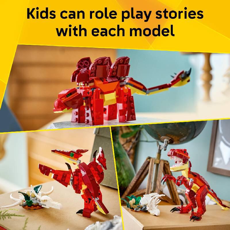 LEGO Creator 3 in 1 Fierce Dinosaur set lets kids ages 8 and up build a Velociraptor toy then rebuild it into a Stegosaurus or Pterosaur.