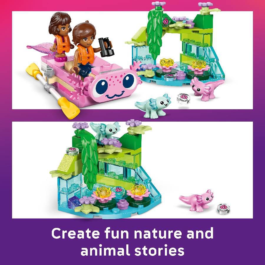 - AXOLOTL TOY BUILDING SET – This kids’ LEGO Friends Axolotl Adventure Boat (42681) includes a mini boat, 2 characters and 2 mini axolotl toys, launching fun play for girls and boys ages 5 years and up.