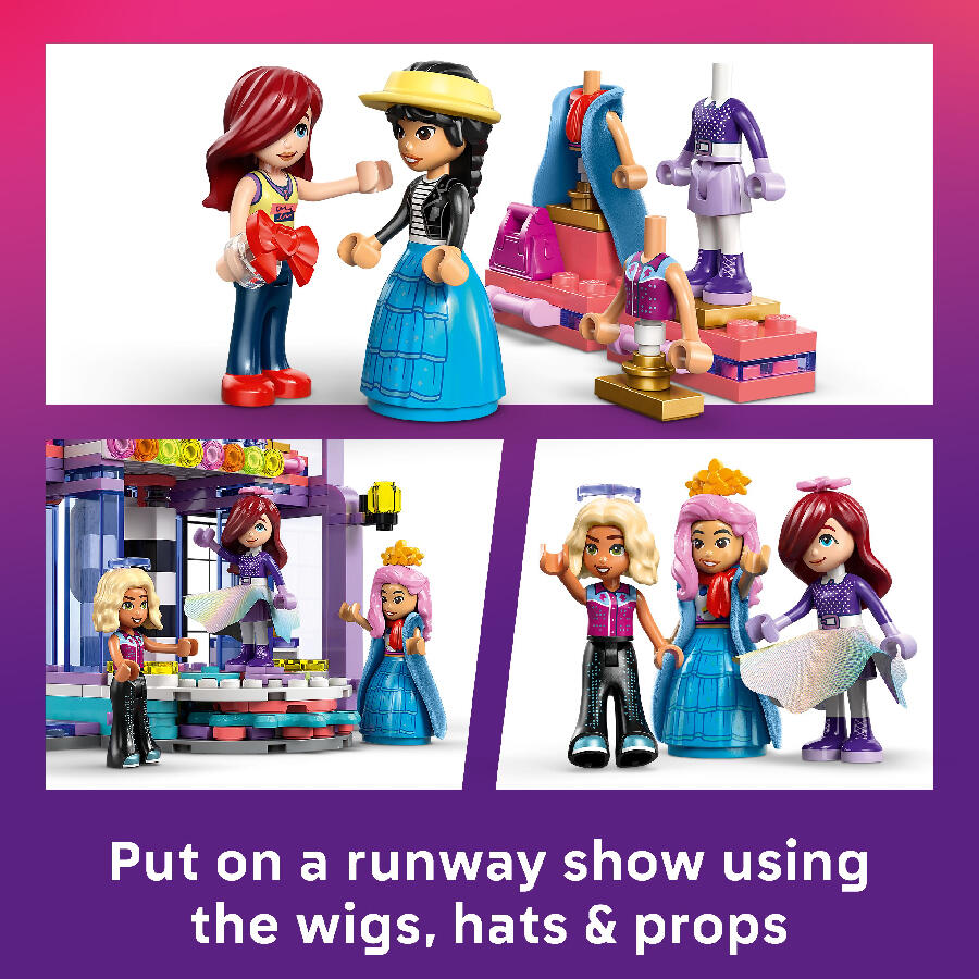 - CUSTOMIZE OUTFITS – Girls and boys can imagine playing fashion designers with the LEGO Friends Heartlake City Fashion Show (42685)combining the torsos, wigs, hats and props to put on a runway show.