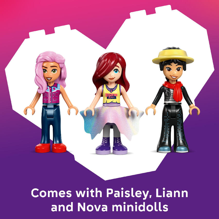 - 3 LEGO FRIENDS CHARACTERS – This fashion and dress up toy comes with 3 minidolls – Paisley, Liann and Nova – to style at the vanity table, then place on the rotating platform to reveal the outfit.