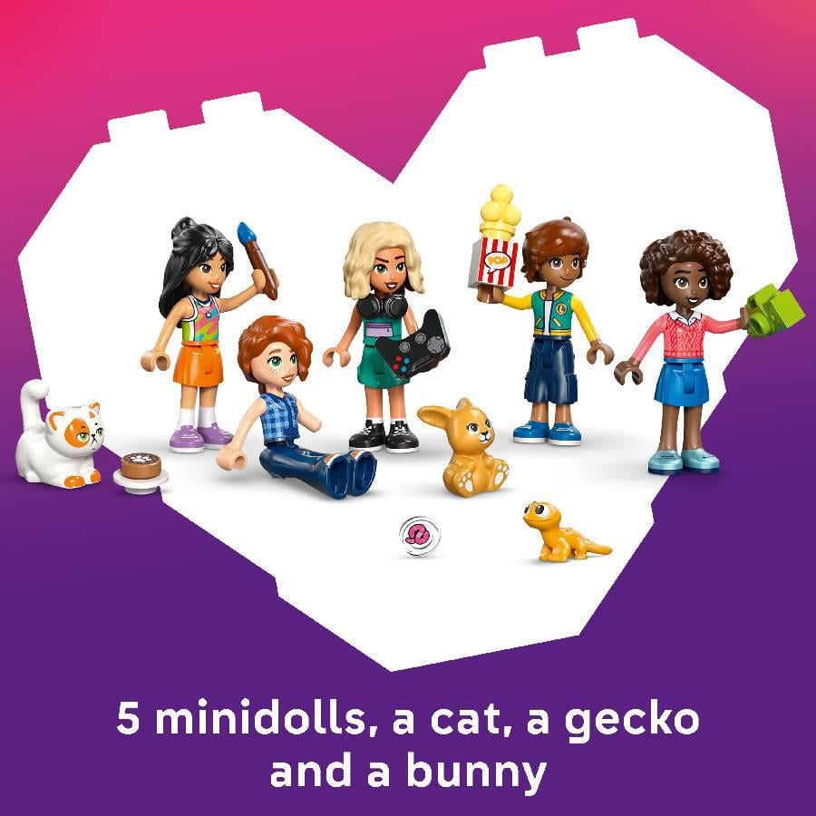 - 5 LEGO FRIENDS CHARACTERS – This role-play toy for kids comes with 5 minidolls– Autumn, Nova, Aliya, Leo and Liann, and pets Churro the cat, Honey the bunny and Popcorn the gecko.