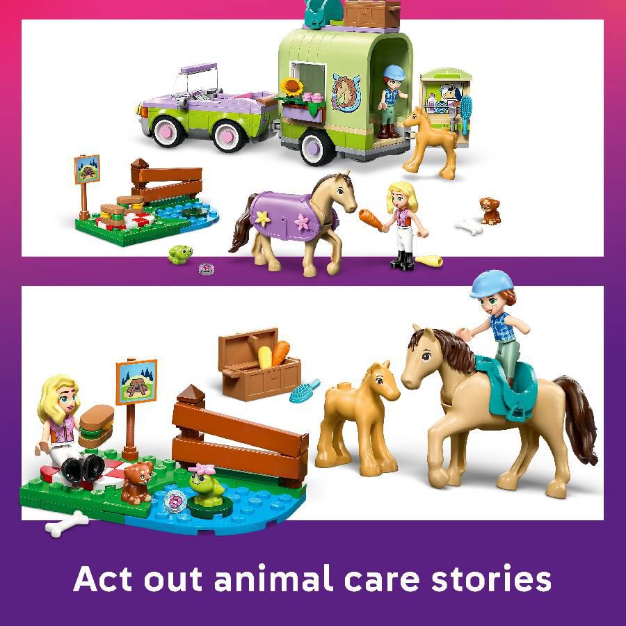 - 2 LEGO FRIENDS CHARACTERS – This detailed LEGO Friends Horse & Baby Foal Trailer (42695) pretend play set comes with Autumn and Matilde minidolls to inspire stories about their passion for horses.