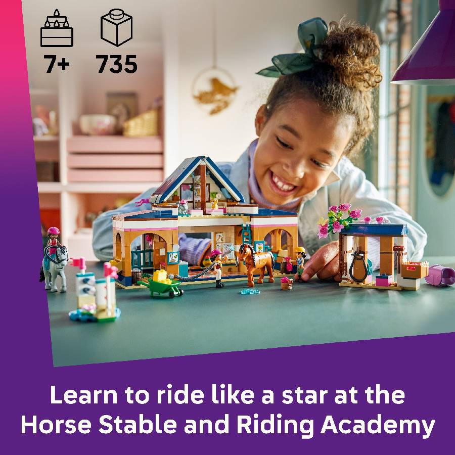 - HORSE STABLES PLAYSET – Kids ages 7 and up can gallop into hours of creative play with this detailed LEGO Friends Horse Stable and Riding Academy (42688), which includes 3 minidolls, 2 horses, puppy.