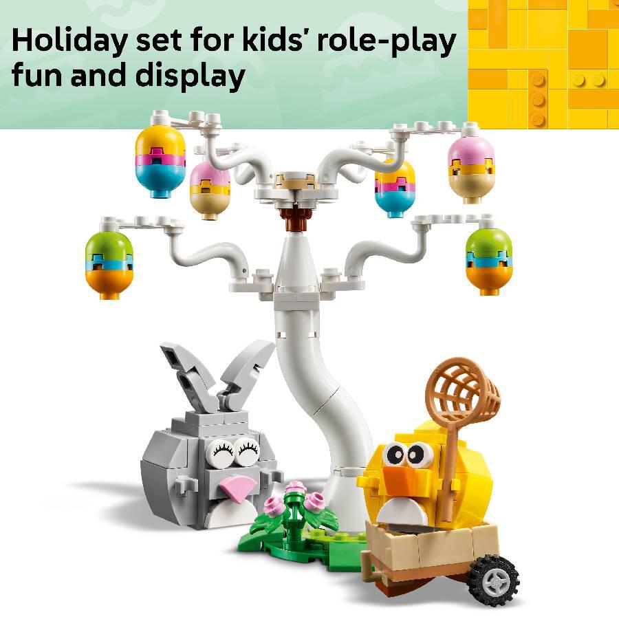 - Easter egg toy – The set includes 2 brick-built LEGO figures, a mischievous Easter Bunny rabbit toy and a bright-eyed bird toy to decorate the tree and collect the eggs.