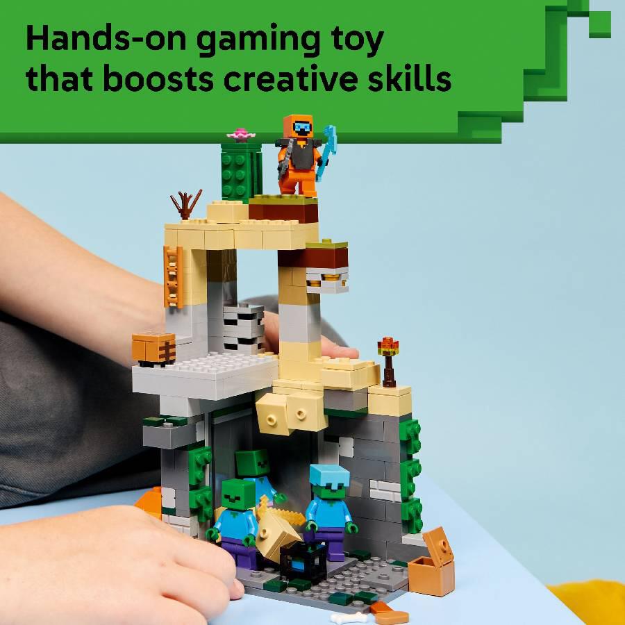 - PRETEND PLAY TOY – Set in the Minecraft desert biome, this set offers hands-on features to inspire imaginative play such as a rotating, zombie-spawning chamber and sliding piece to trigger a rockfall.