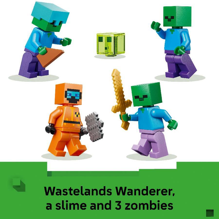 - 3 ZOMBIE FIGURES – Includes a Wastelands Wanderer minifigure, a slime and 3 zombies, including one with enchanted leggings and gold sword and one with diamond helmet.