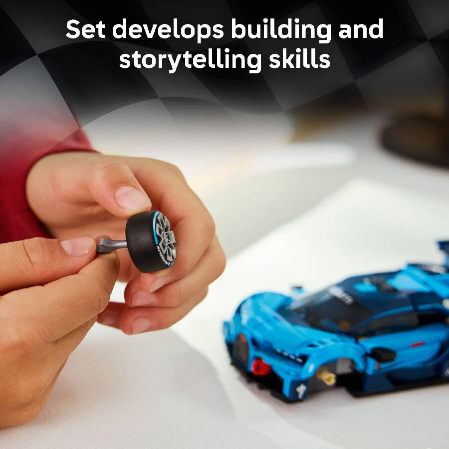 Kids ages 9 and up and gamers can build, display and race this LEGO Speed Champions Bugatti Vision Gran Turismo Hyper Sports Car toy model.