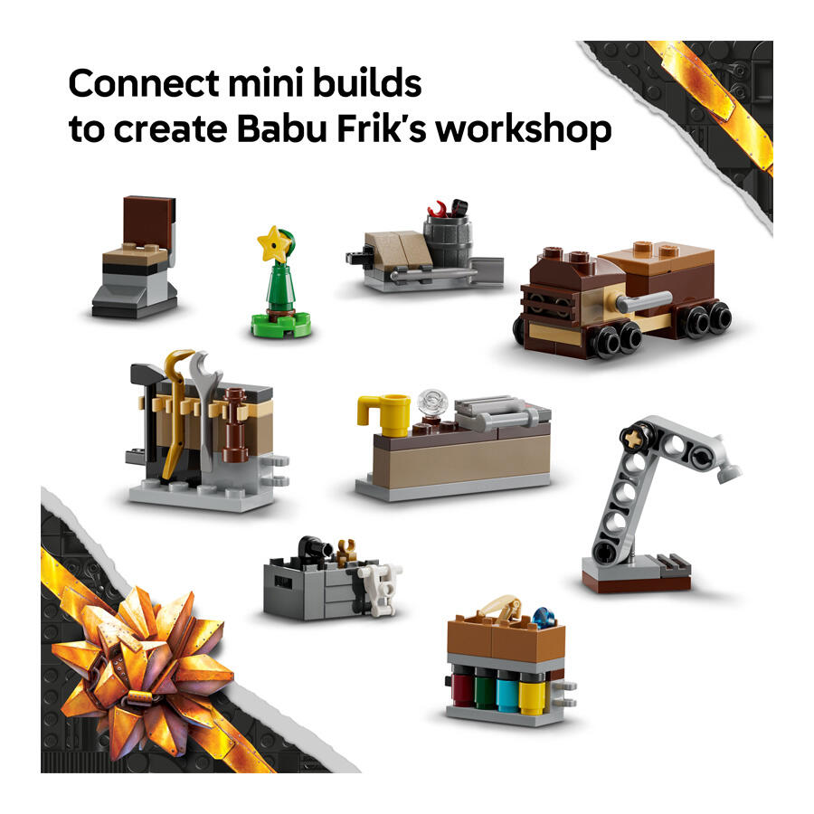 An Advent calendar packed with Star Wars Christmas gifts, including LEGO droid figures and mini build toys, for kids to create a Babu Frik workshop.