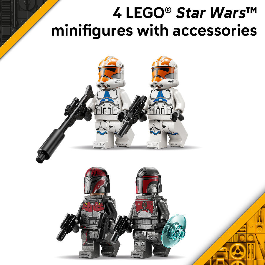 - 4 LEGO STAR WARS MINIFIGURES – Equip the 2 Mandalorian Super Commandos with 2 jetpacks and 3 blaster pistols, and the 2 332nd Clone Troopers with a blaster and blaster rifle.