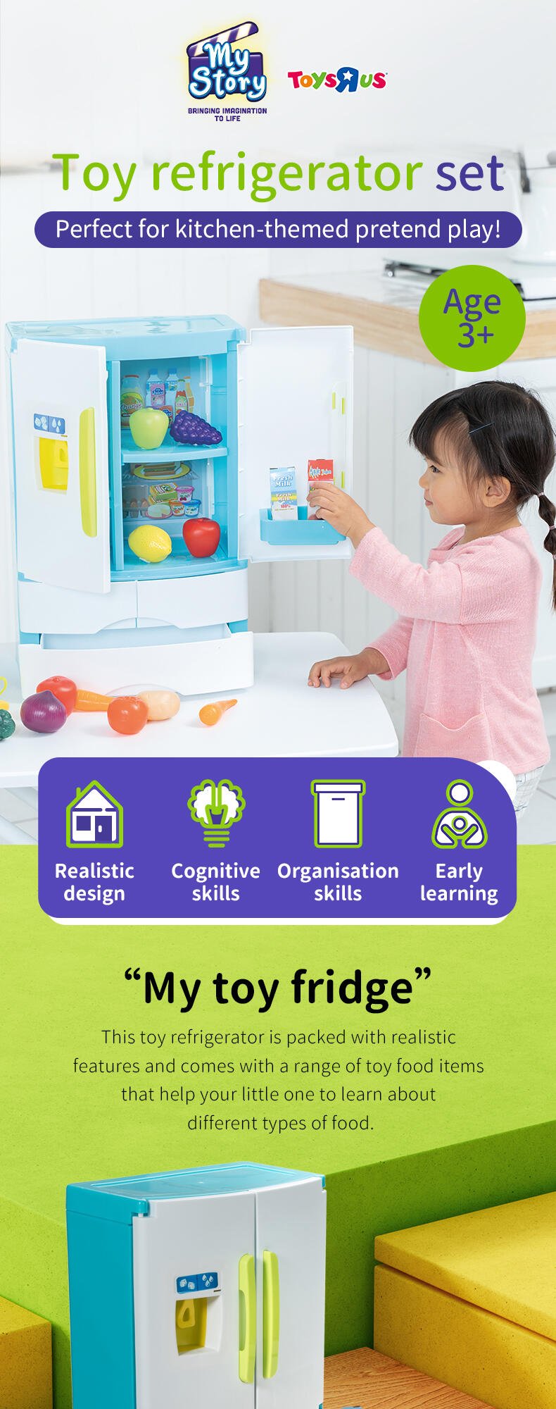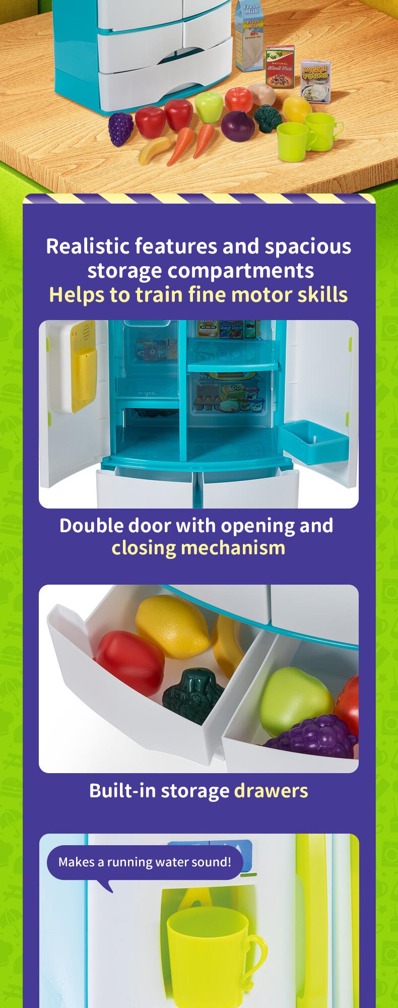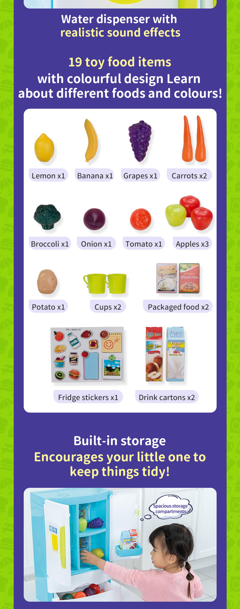 The Mini Fridge is the perfect addition to your little one’s play kitchen or home setup, and will encourage creative and imaginative development, with kids free to explore and develop their own rich and exciting stories and games. The fridge has lots of storage for food items, and the water dispensing sound effect makes for a realistic and authentic play experience. This set includes food items like fruits, vegetables and boxed snacks so that little ones can immerse themselves in the experience of cooking, prepping and serving meals. Its the start of some cool storytelling