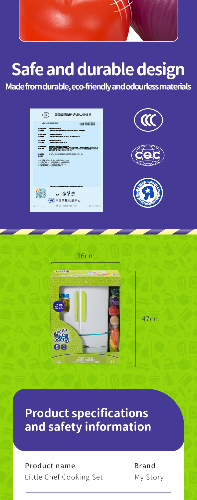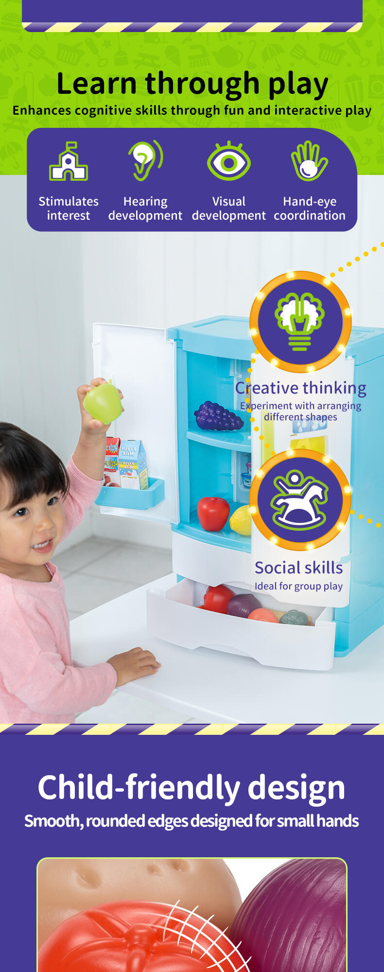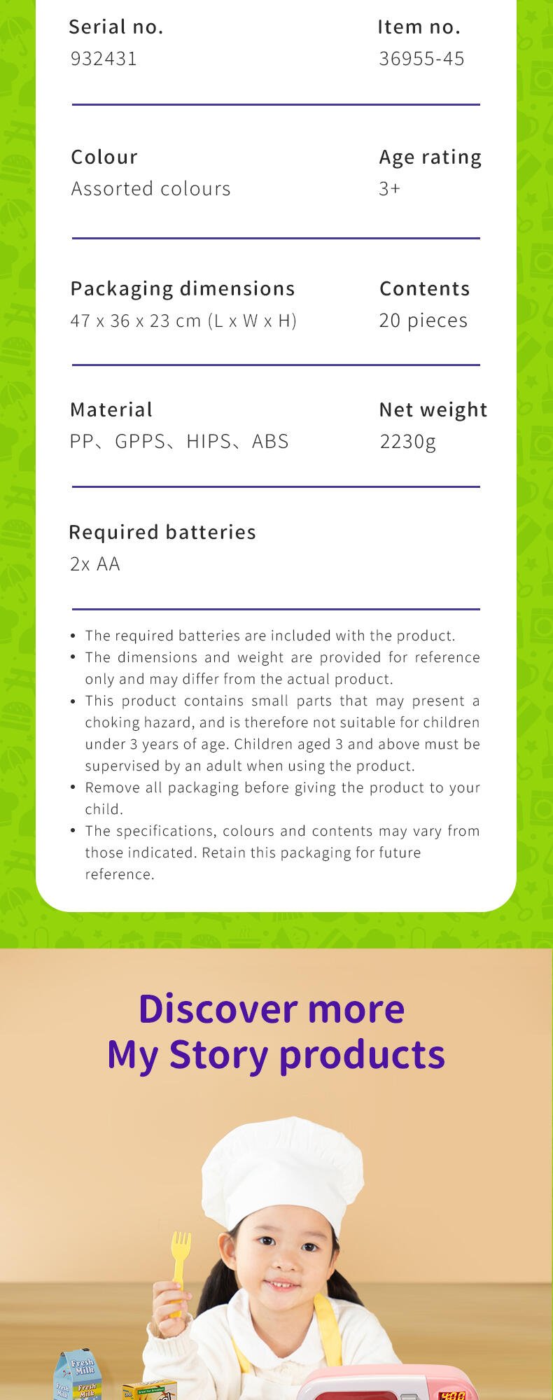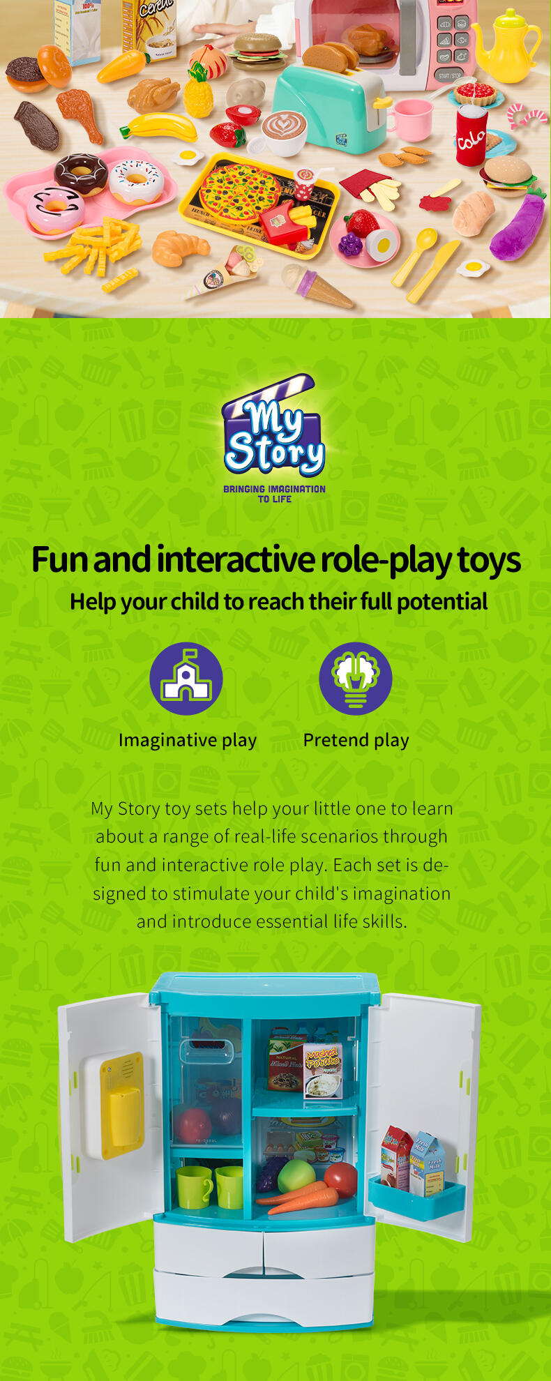 The Mini Fridge is the perfect addition to your little one’s play kitchen or home setup, and will encourage creative and imaginative development, with kids free to explore and develop their own rich and exciting stories and games. The fridge has lots of storage for food items, and the water dispensing sound effect makes for a realistic and authentic play experience. This set includes food items like fruits, vegetables and boxed snacks so that little ones can immerse themselves in the experience of cooking, prepping and serving meals. Its the start of some cool storytelling
