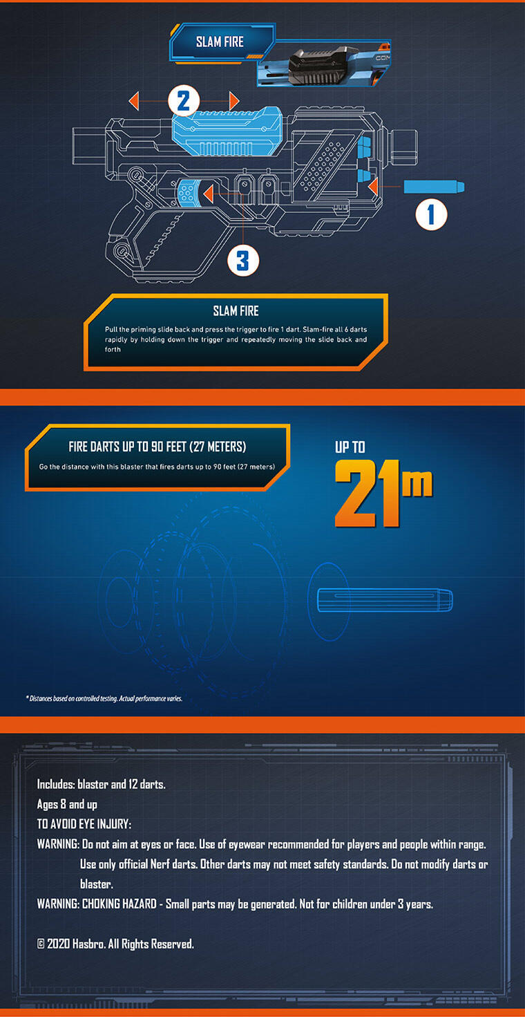 • SLAM FIRE: Pull the priming slide back and press the trigger to fire 1 dart. Slam-fire all 6 darts rapidly by holding down the trigger and repeatedly moving the slide back and forth