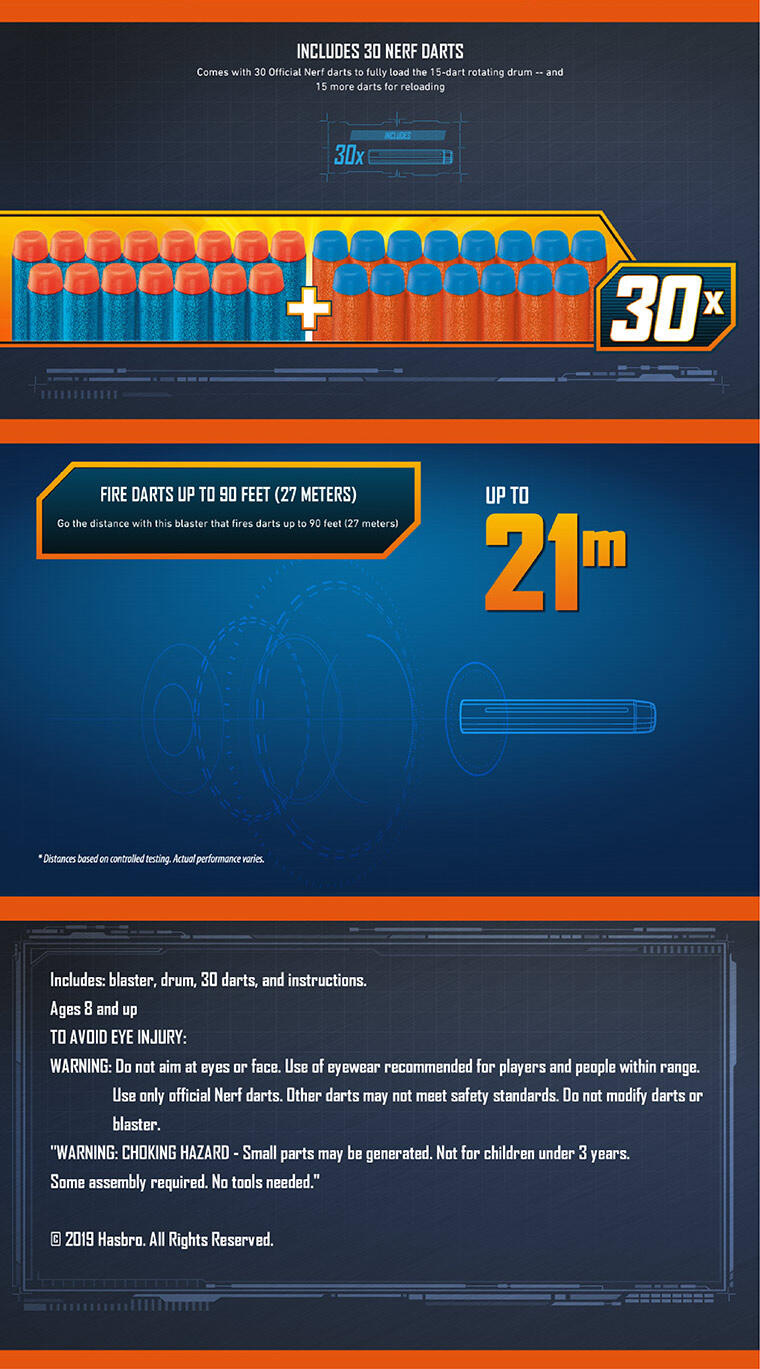 • INCLUDES 30 NERF DARTS: Comes with 30 Official Nerf darts to fully load the 15-dart rotating drum -- and 15 more darts for reloading. Features slam-fire action to fire all 15 darts fast!