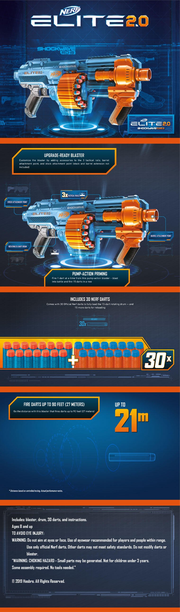 The Nerf Elite 2.0 Shockwave RD-15 blaster features customizing capabilities that include 3 tactical rails, barrel attachment point, and stock attachment point to optimize for battle. This pump-action blaster has a 15-dart rotating drum to swamp your targets. Pull the priming slide back and press the trigger to unleash 1 dart, or hold down the trigger and keep moving the slide to slam-fire all 15 darts. Includes 30 Official Nerf darts -- 15 for the drum, and 15 for reloads. Fires darts up to 90 ft (27 m). Eyewear recommended. Barrel extension, stock, and eyewear not included. No batteries required.