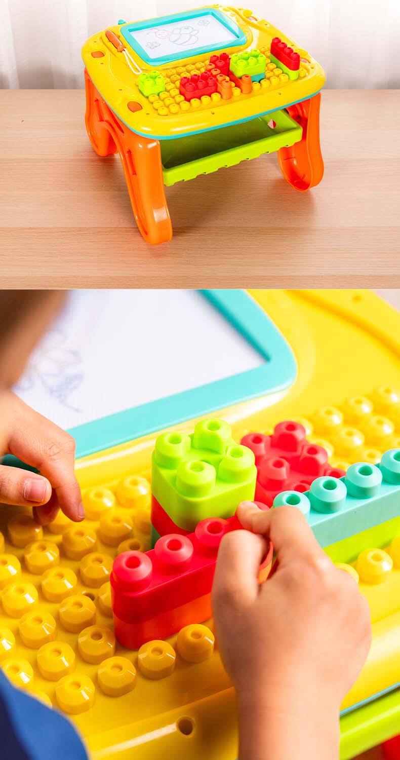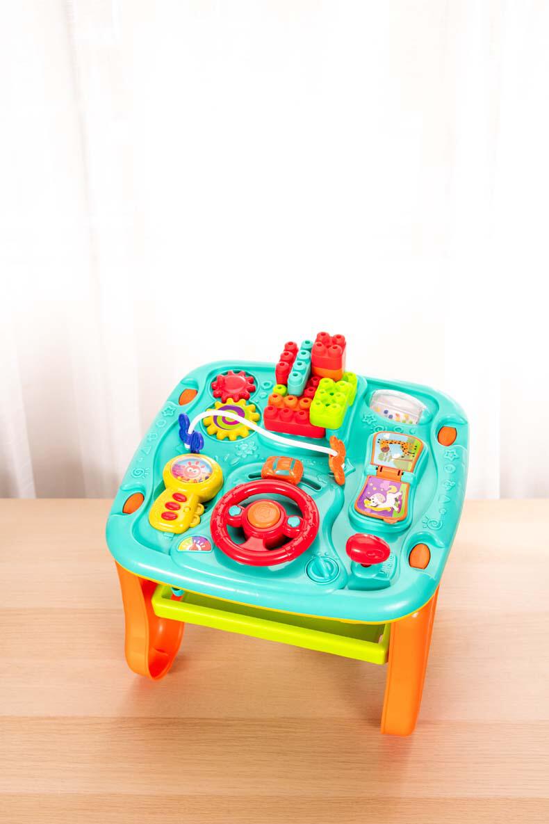 • A vibrant, interactive double-sided play table featuring a wide array of engaging activities
