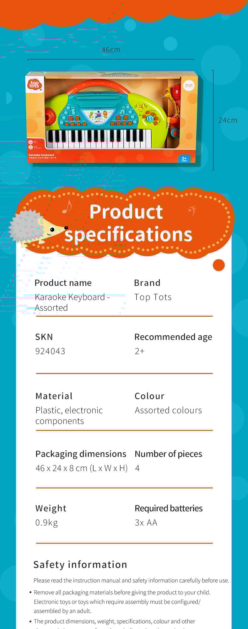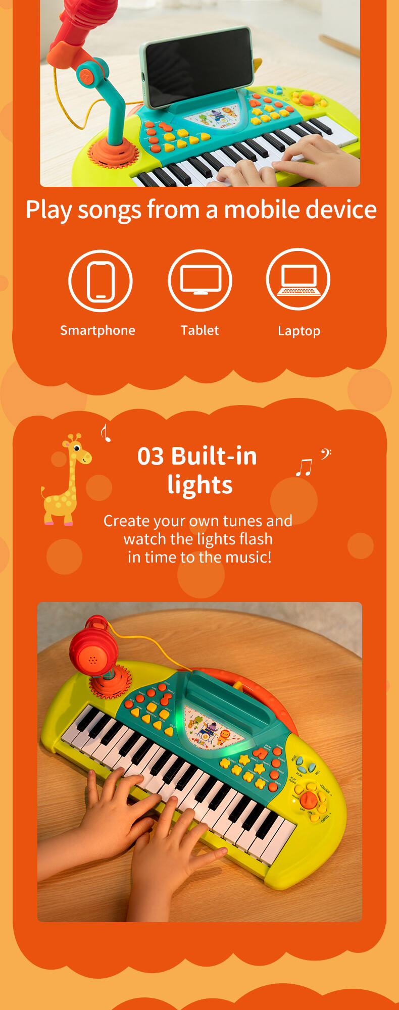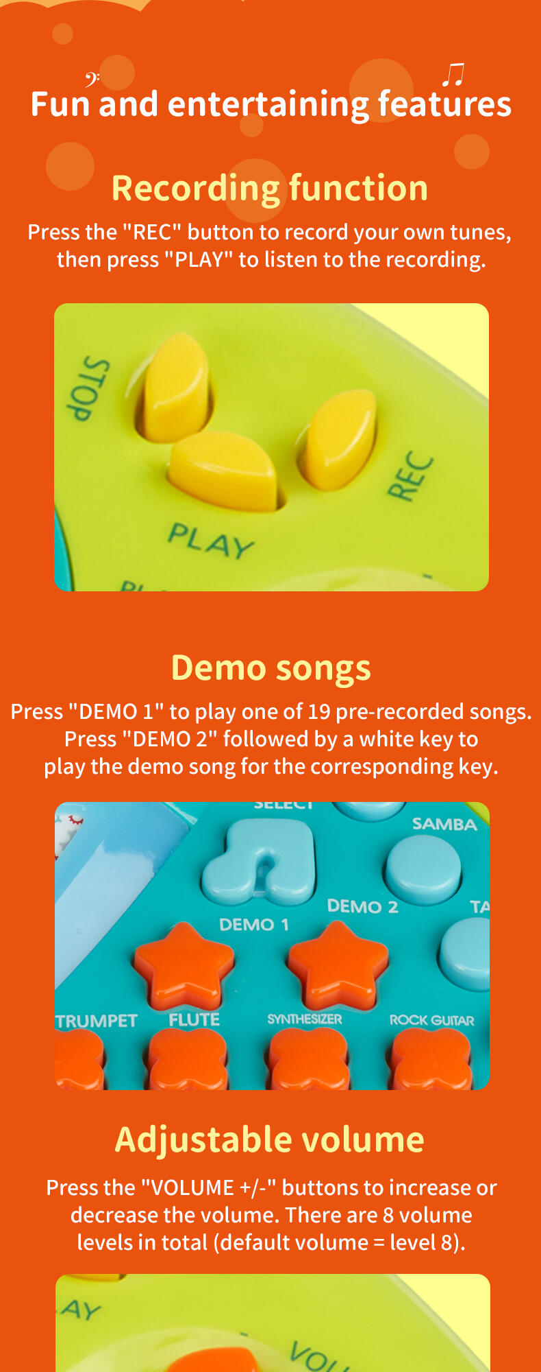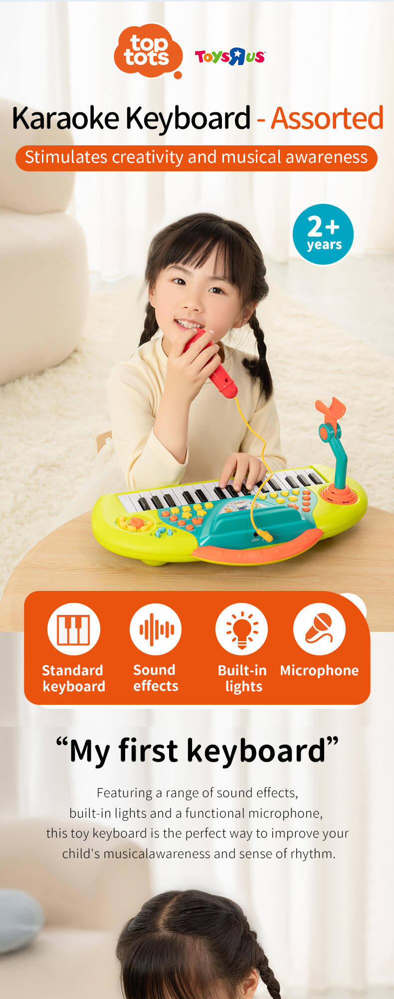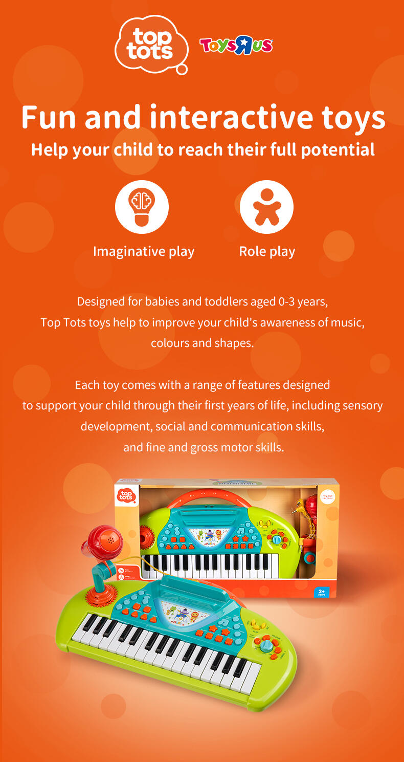 Programmed with multiple instrumental sounds, songs and rhythms, the Karaoke Keyboard is a great creative companion for solo play or with friends. The microphone and stand allow your child to record and playback their performance.