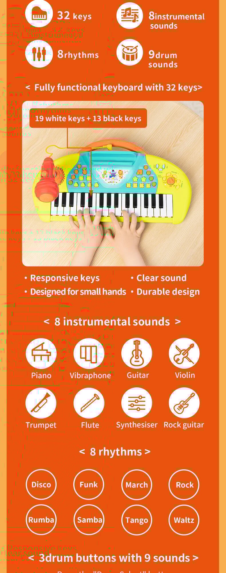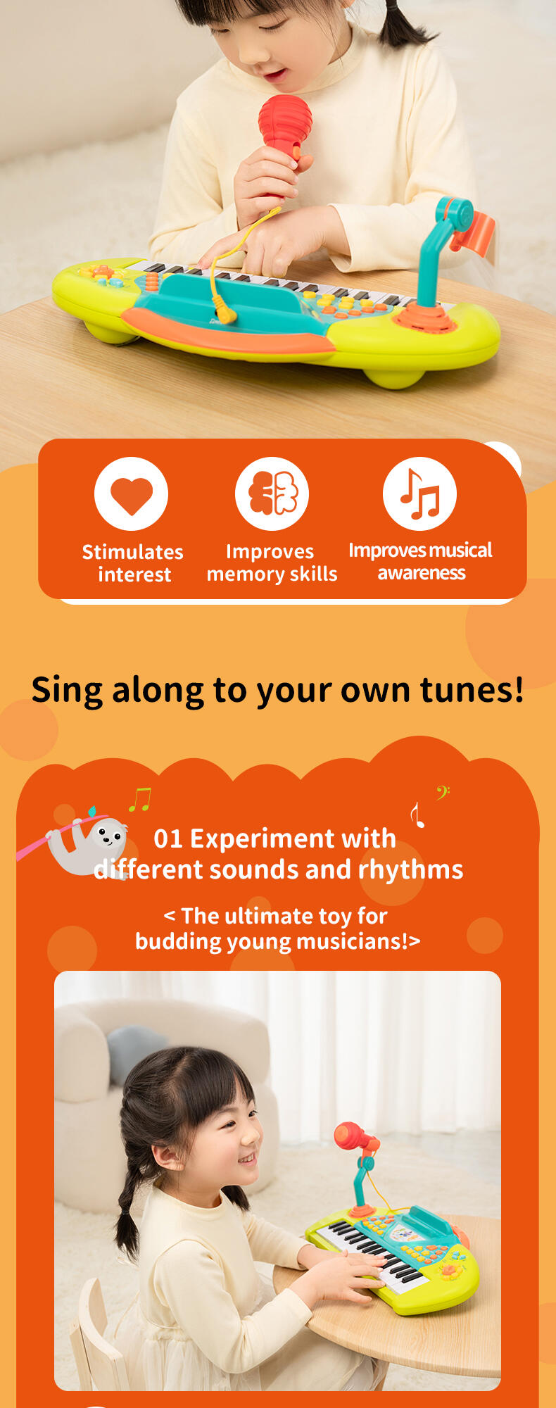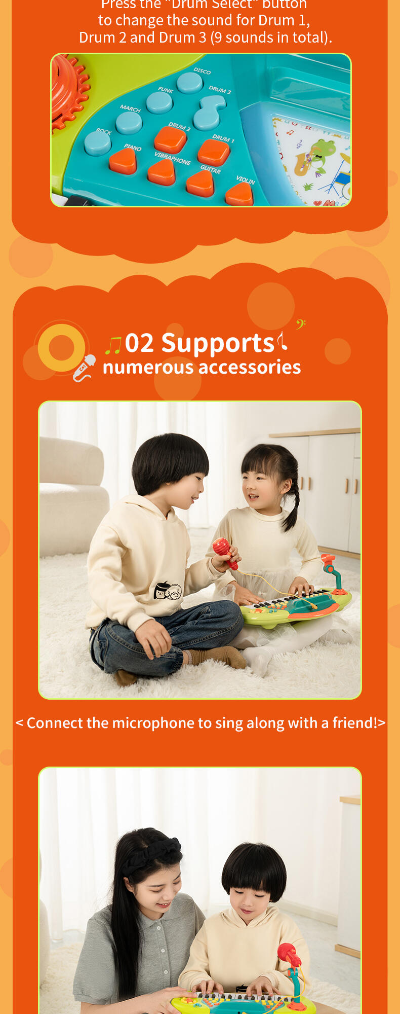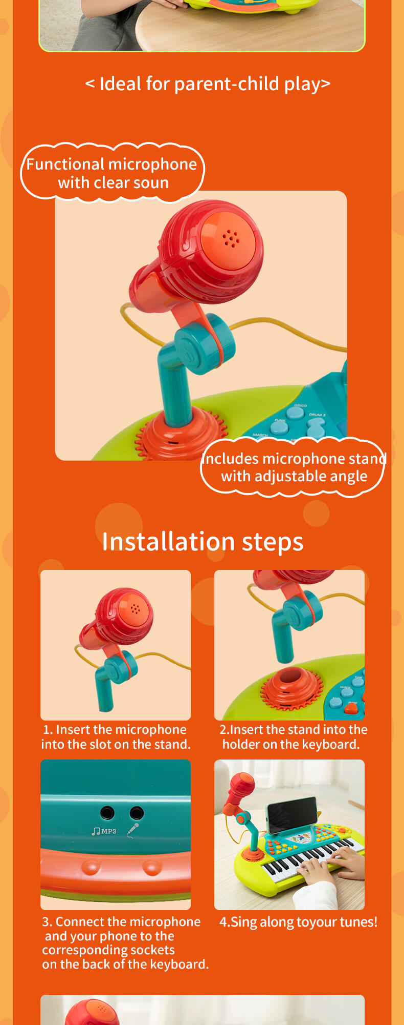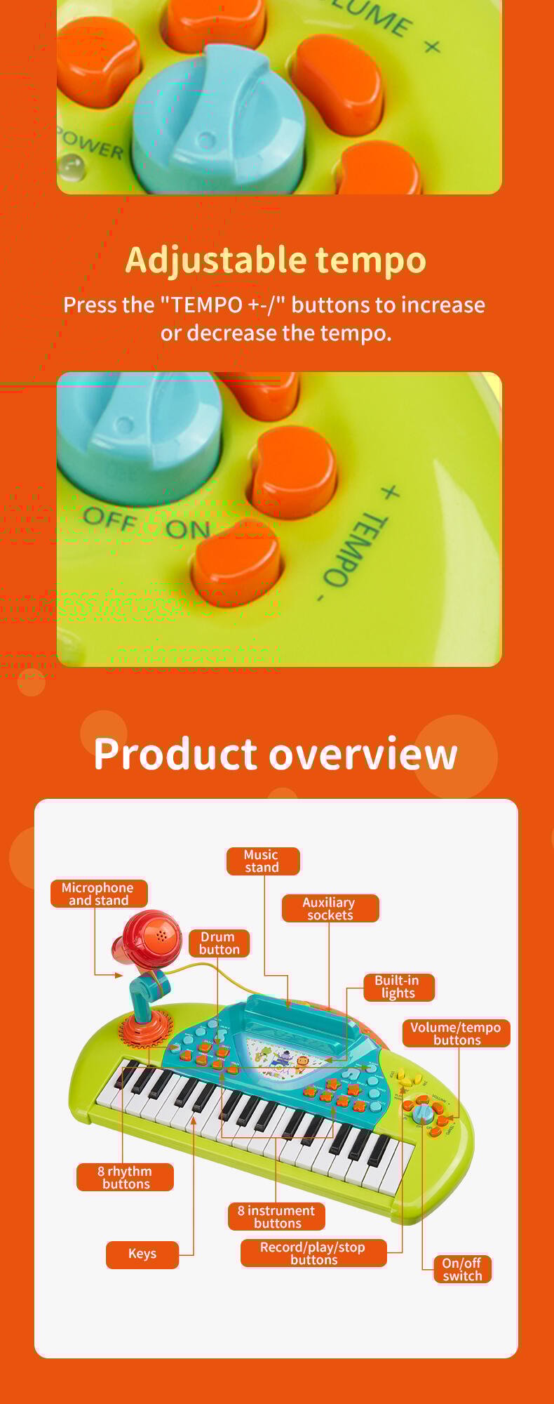 Programmed with multiple instrumental sounds, songs and rhythms, the Karaoke Keyboard is a great creative companion for solo play or with friends. The microphone and stand allow your child to record and playback their performance.