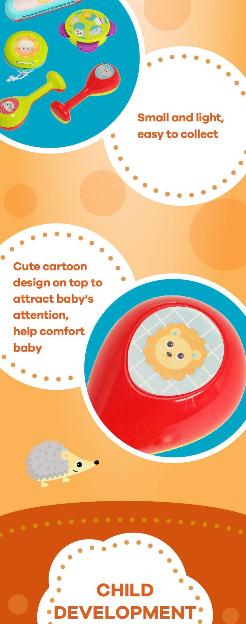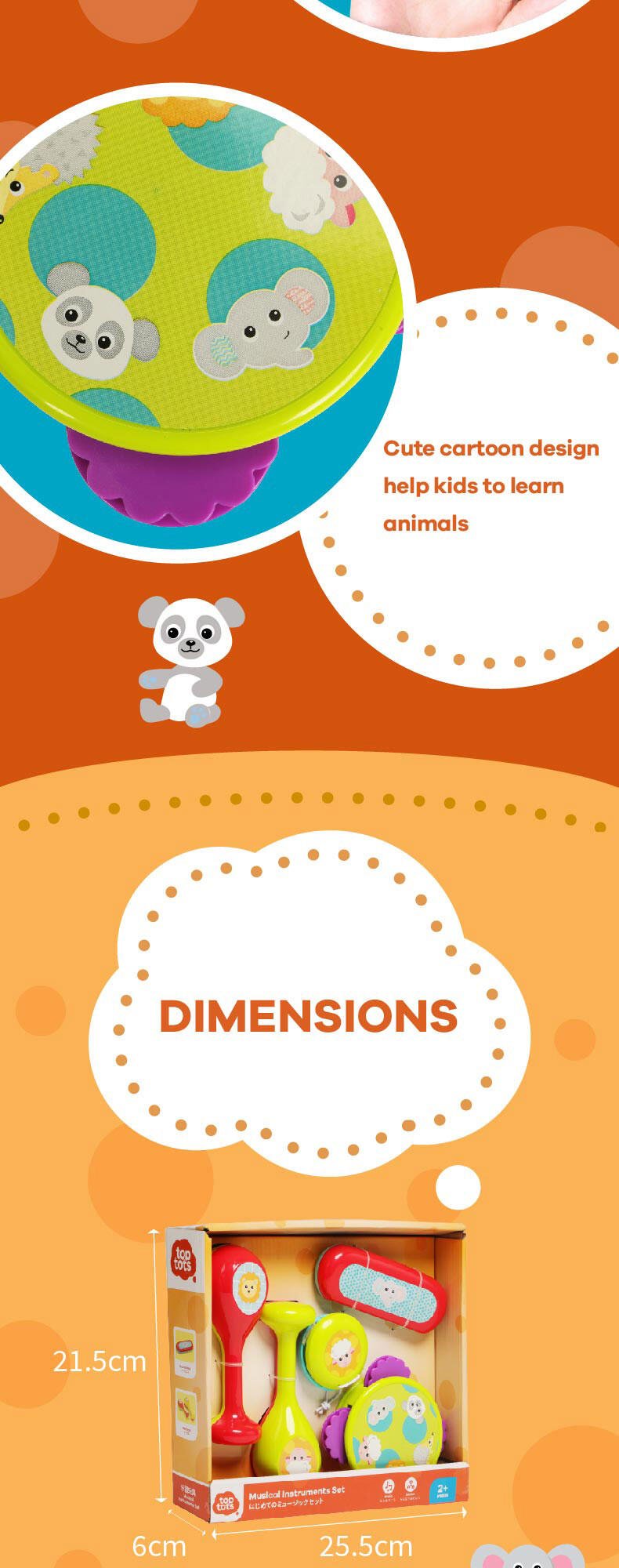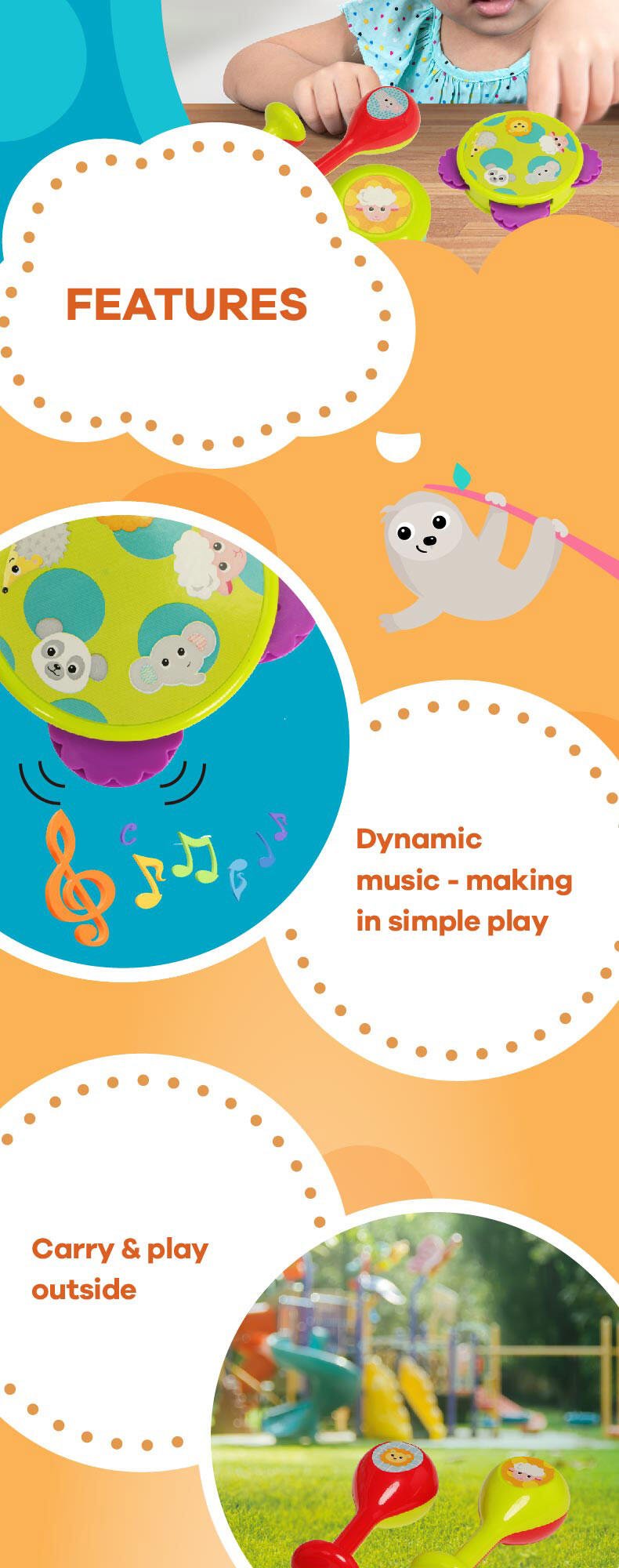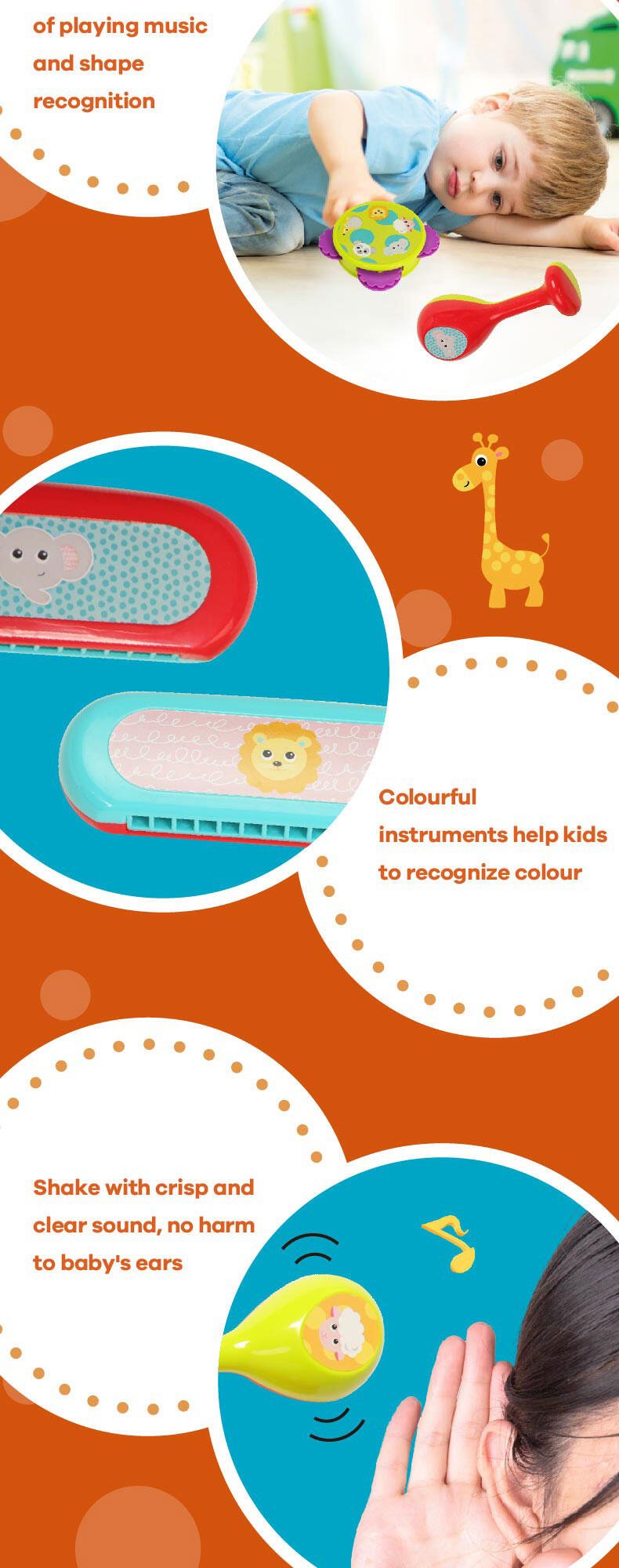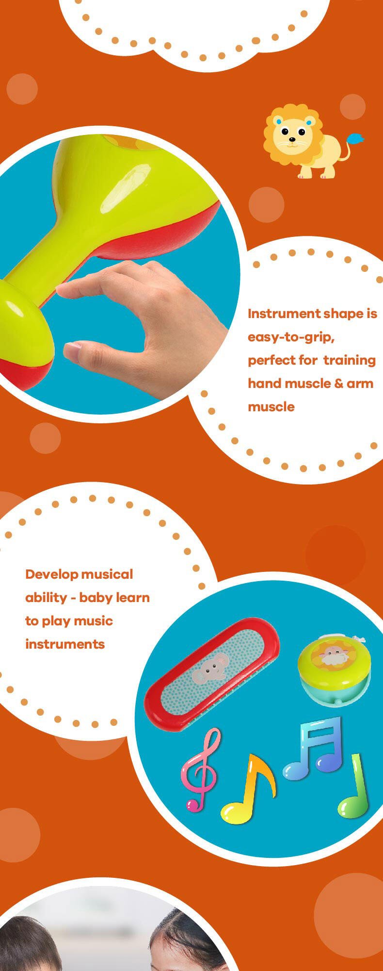 The gig's about to start! We Can't wait!' Here comes your toddler's solo and group jamming sessions with these four well-liked instruments on this early learning platform. All the instrument play and shaking fosters the players' love of music, creativity and hand-eye coordination while putting them at ease and keeping them focused.
