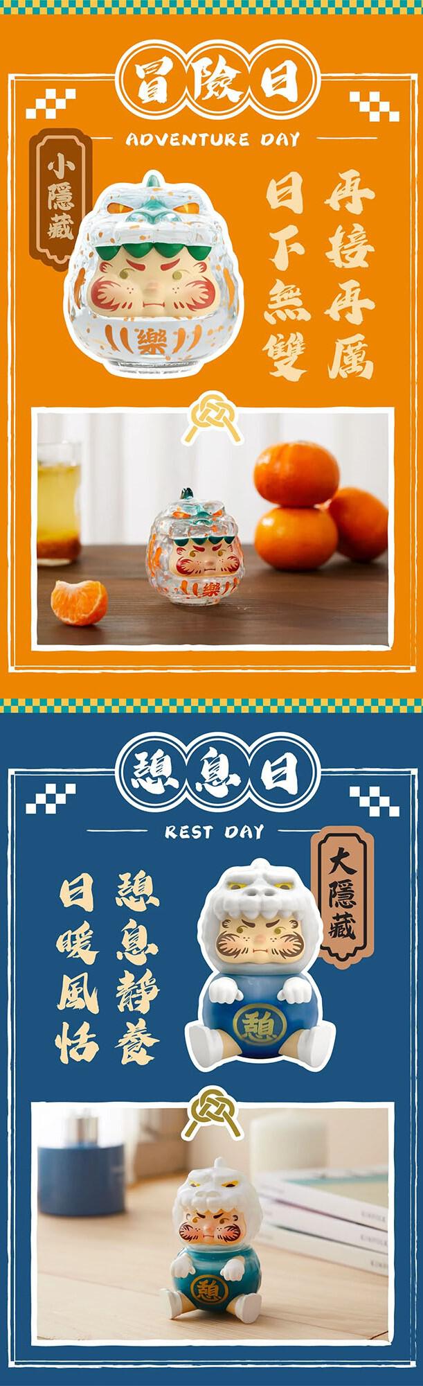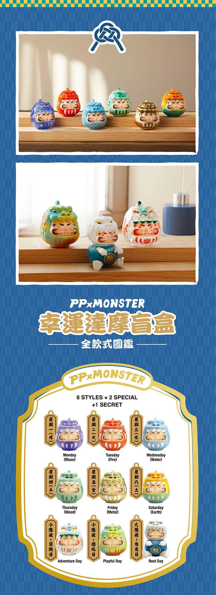 Each Daruma has different attributes and metaphors and bring you blessing through the week! The big hidden Daruma has the metaphor of "Rest Day", so that you can forget the tireness of the day! Collect a set of PP X Monster Lucky Daruma Blind Box and let PP BABY guard your every day.
