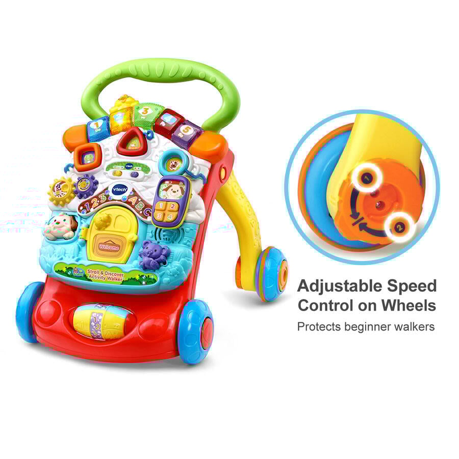 From floor play to first steps, the VTech® Stroll & Discover Activity Walker grows with your little one. The easy-to-remove activity panel is great for floor play and is packed with features and the legs fold for easy storage. Five light-up piano keys introduce colors and numbers, while spinning gears and a removable cell phone help develop fine motor skills. Meet six friendly animals by inserting the three shape sorter pieces, pressing the puppy button, sliding the mouse or batting the bird to hear their unique voices and sounds. Attach the panel to the adjustable two-speed walker as little ones grow, and watch them go!