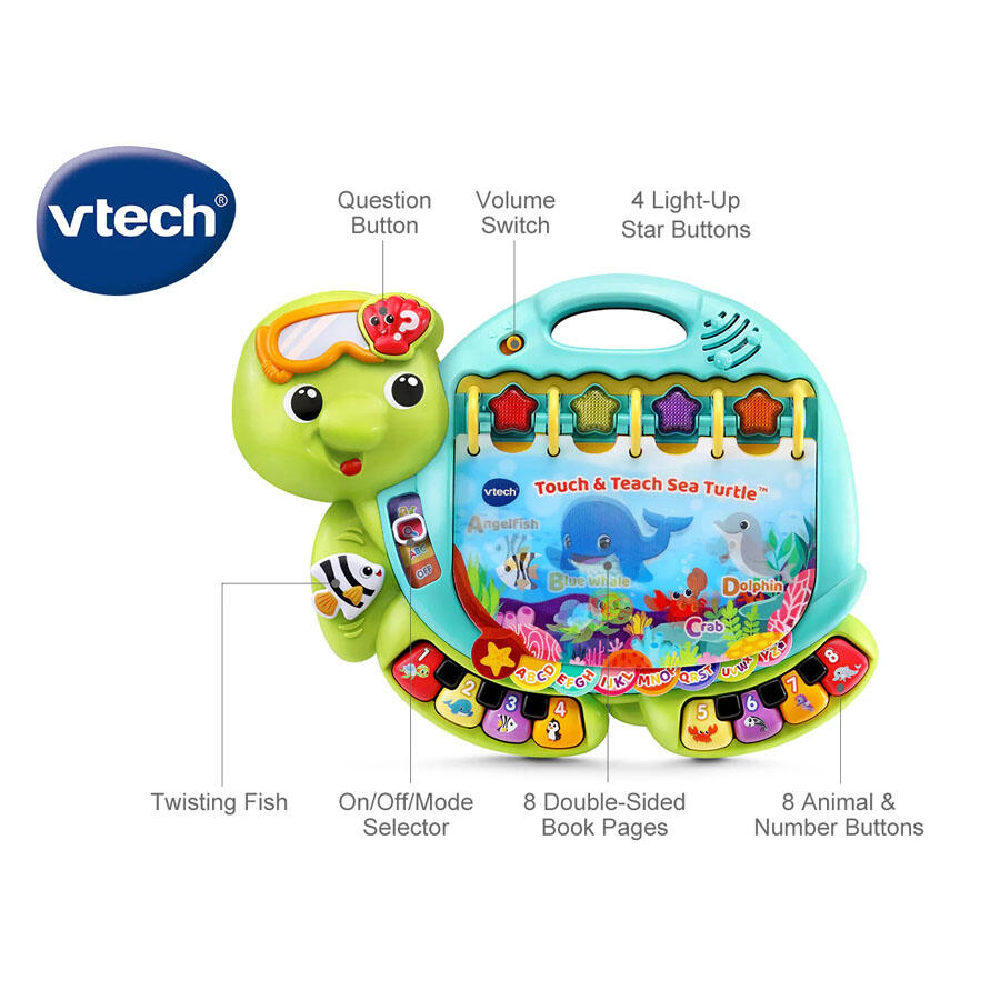 Dive into early reading with your toddler in the Touch & Teach Sea Turtle™ interactive story book. A holographic cover, bright colors and light-up buttons draw and hold your little one's attention on eight double-sided book pages. Sea creatures fill this deep-sea story with learning experiences focused on letters, numbers, colors and animals with three learning modes. Press the piano key buttons on each page to hear the names of a variety of sea animals, listen to their sounds and practice counting. Go exploring with four light-up starfish and quiz questions that get little ones thinking and looking. Enjoy a robust 225+ songs, melodies, sounds and phrases in this take-along toddler book with carrying handle. Batteries included for demo purposes only. New batteries recommended for regular use.