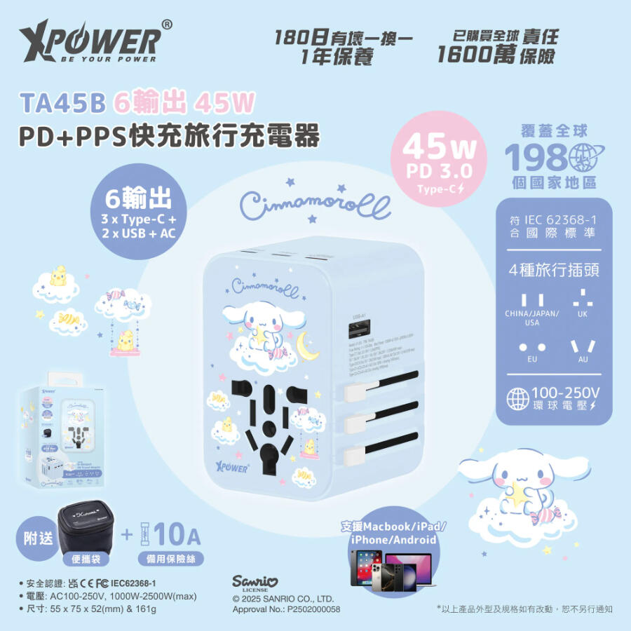 XPower Sanrio Cinnamoroll TA45B 45W 6-Output PD 3.0/PPS Travel Adapter