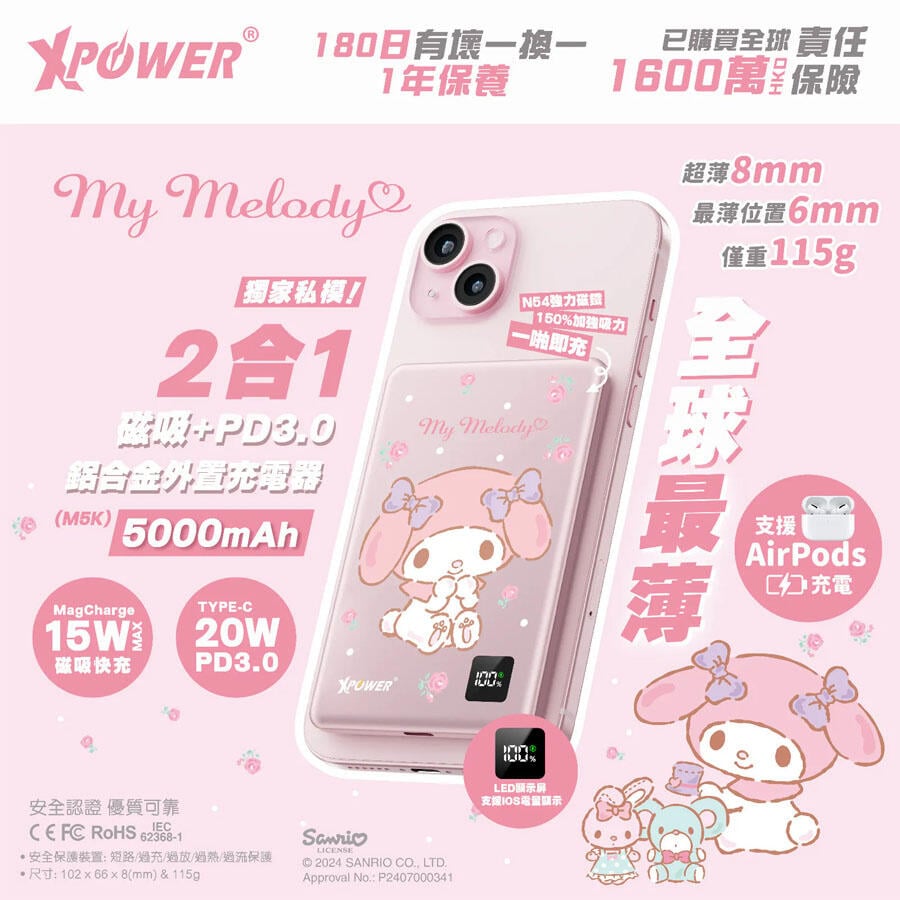 XPower Sanrio My Melody 3 in 1 PD 3.0+MagSafe 5000mAh Ultra-thin Aluminium Power Bank (M5K)