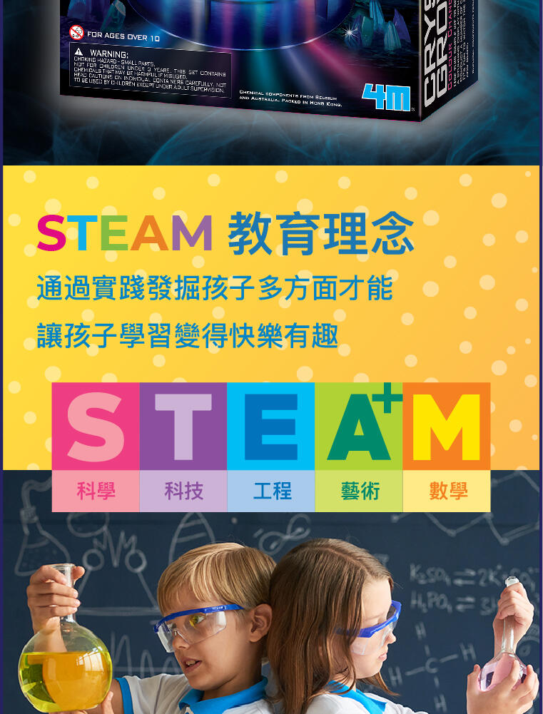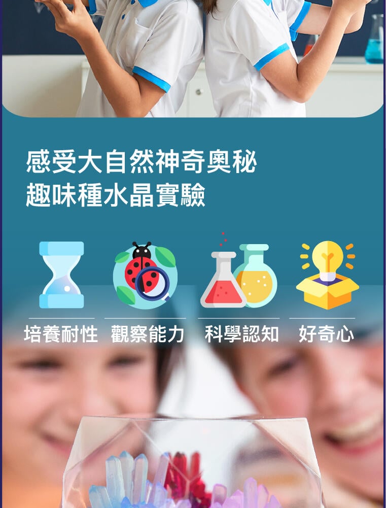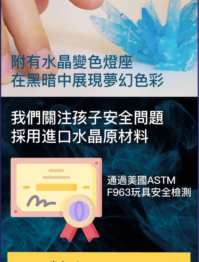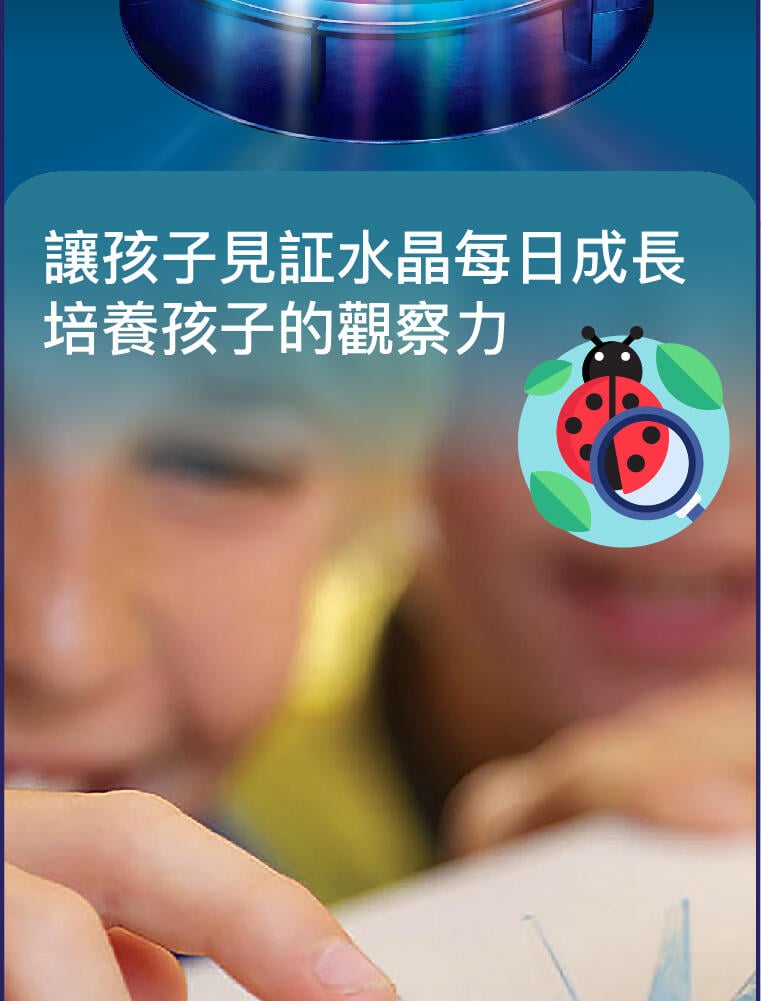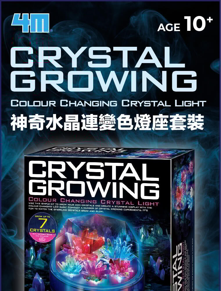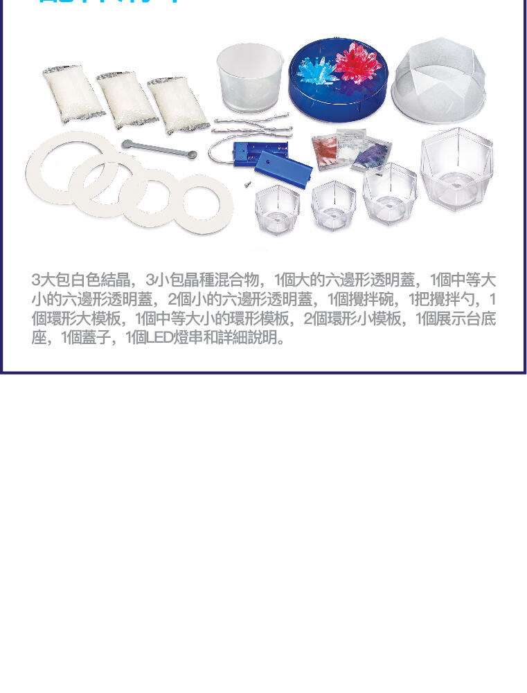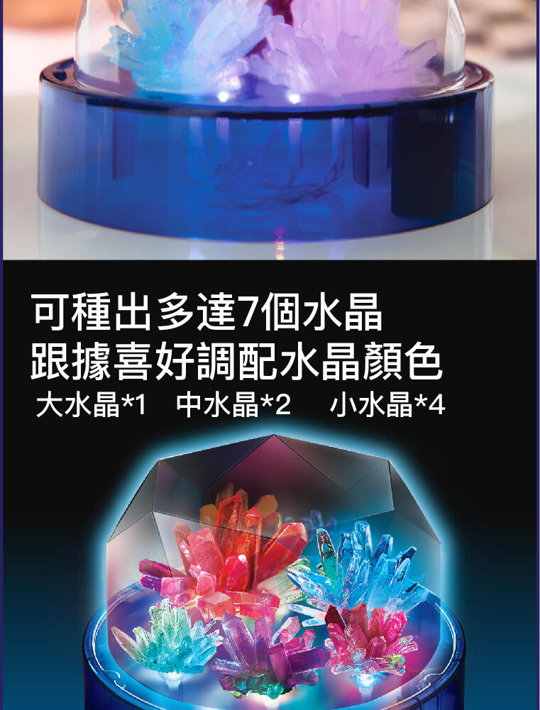 使用這套簡單的工具即可生長出自己的水晶,並透過變色的LED燈座創造出令人驚嘆的擺設! 進行一些晶體生長實驗。 看著閃爍的水晶長大並發光,這很有趣。