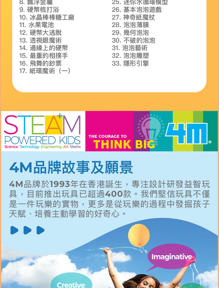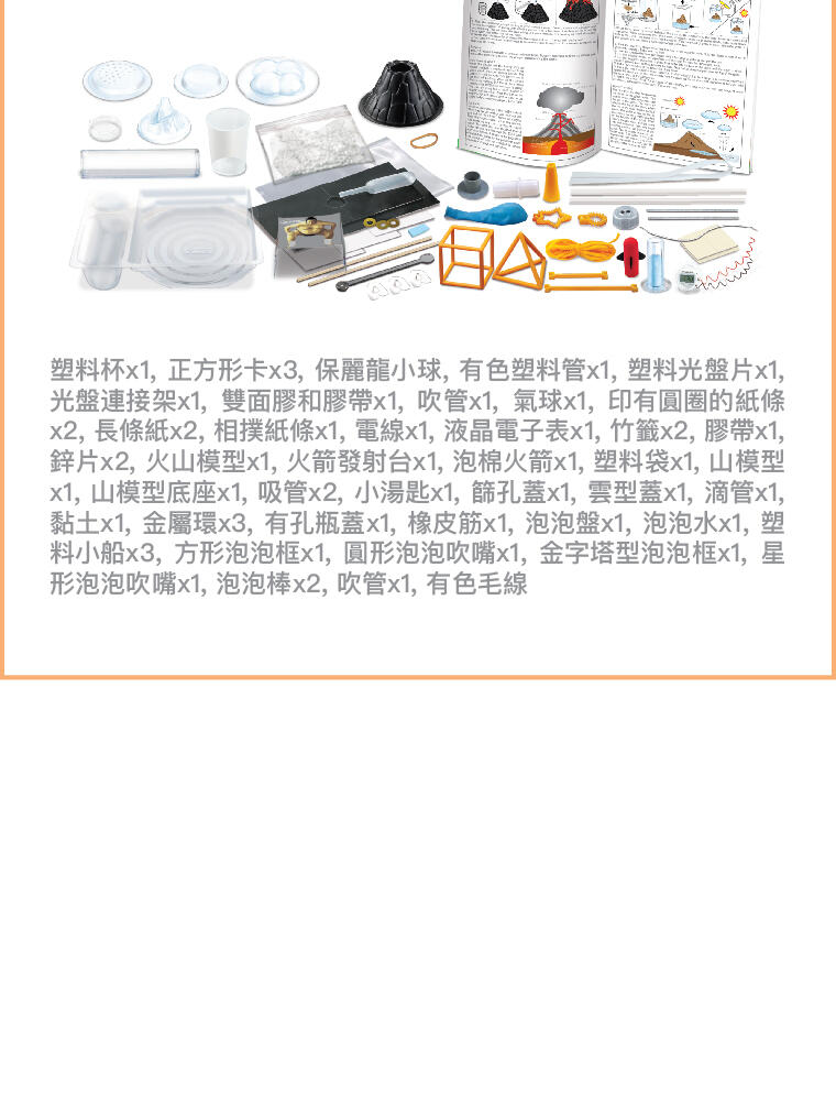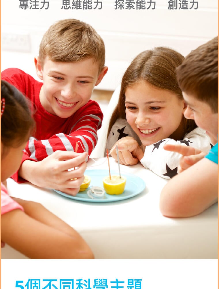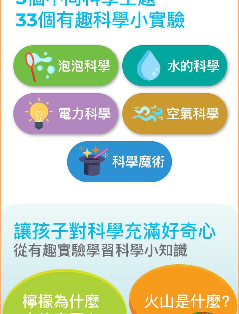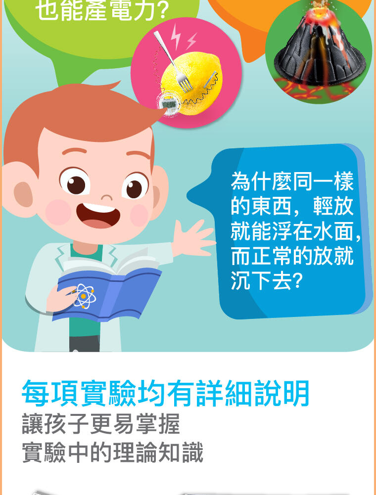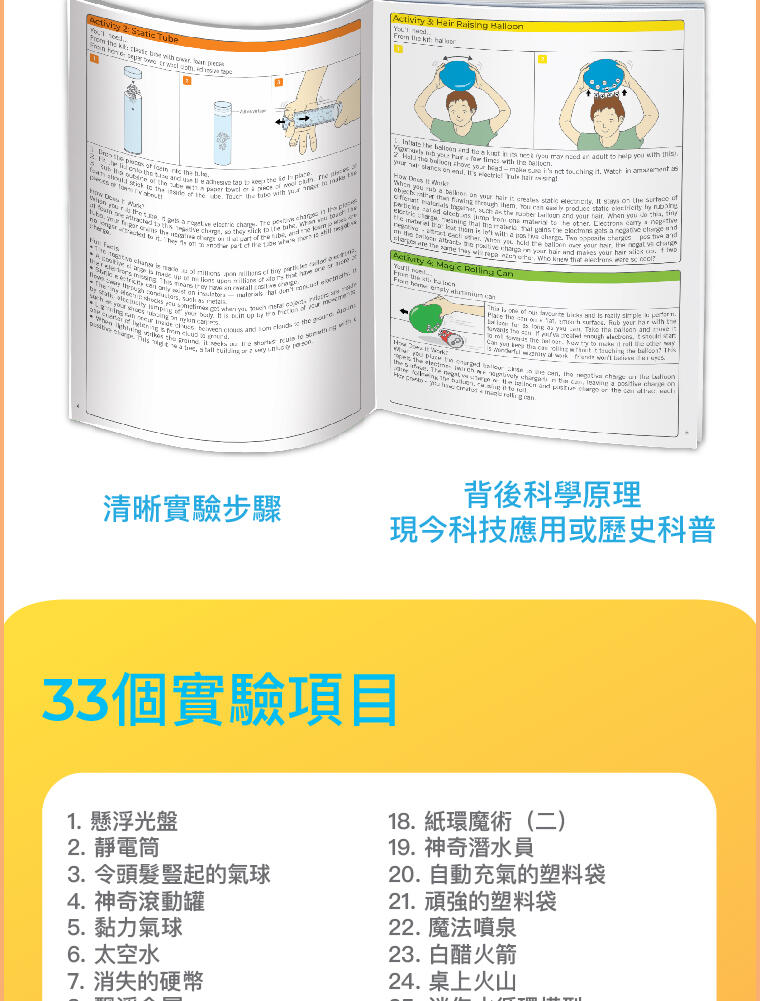 發掘我們日常生活中科學的樂趣和興奮!「科學探索套裝」包含了30多個有趣的有趣實驗: 實驗一 懸浮光碟實驗二 靜電筒實驗三 令頭髮豎起的氣球實驗四 神奇滾動罐實驗五 黏力氣球實驗六 太空水實驗七 消失的硬幣實驗八 飄浮金屬實驗九 硬幣梳打浴實驗十 冰晶棒棒糖工廠實驗十一 水果電池實驗十二 硬幣大逃脫實驗十三 透視眼魔術實驗十四 邊緣上的硬幣實驗十五 最重的相撲手實驗十六 飛舞的鈔票實驗十七 紙環魔術(一)實驗十八 紙環魔術(二)實驗十九 神奇潛