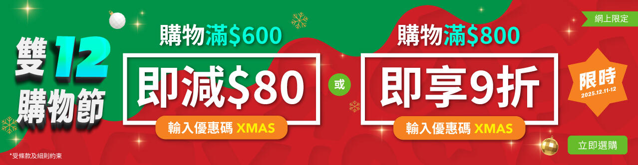 雙12購物節 - 於付款前輸入優惠碼 “1212”,購物滿$600即減$80。購物滿$800即享9折。