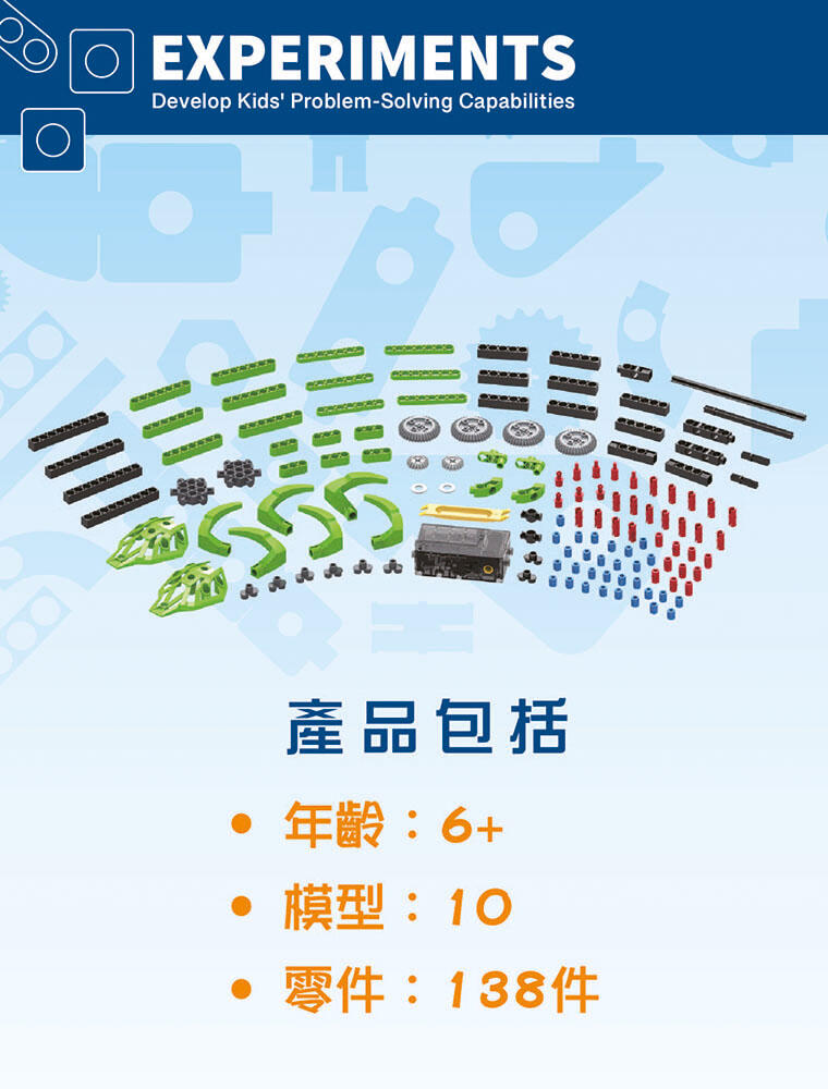 • 全新設計的齒輪盒,具更快的速度與扭力,可以切換馬達正、反轉,具高度組裝性(可快速組裝 ),使用者可以很容易組裝出各種變化