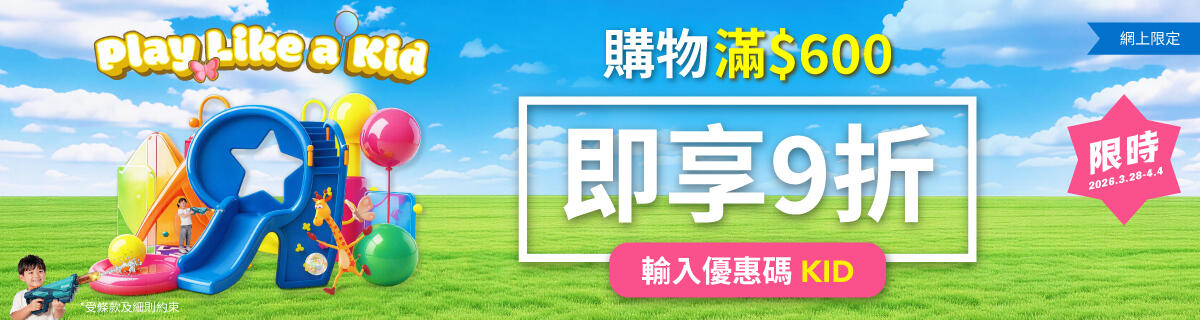 兒童節優惠 - 於付款前輸入優惠碼 “KID”,購物滿$600即享9折。