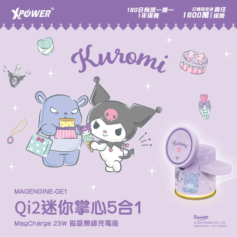 (特別訂購)XPower x Sanrio Kuromi GE1 Qi2迷你掌心5合1 MagCharge 15W磁吸無線充電座