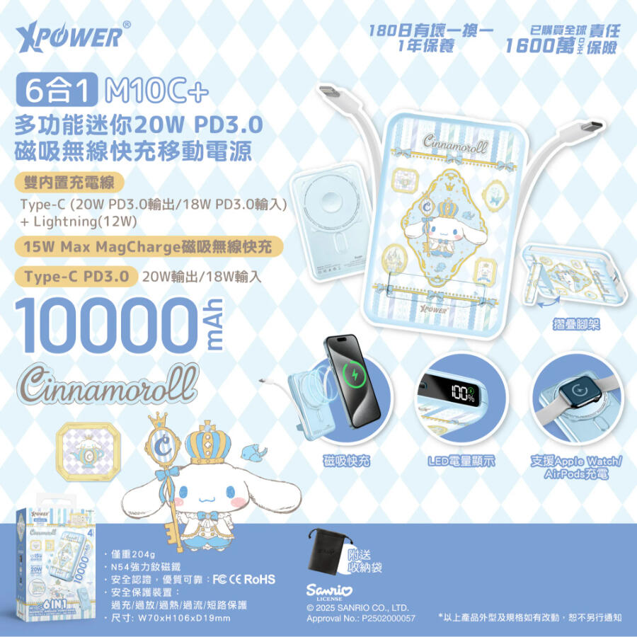 XPower Sanrio 玉桂狗 M10C+ 6合1 10000mAh多功能迷你20W PD3.0+磁吸無線快充移動電源