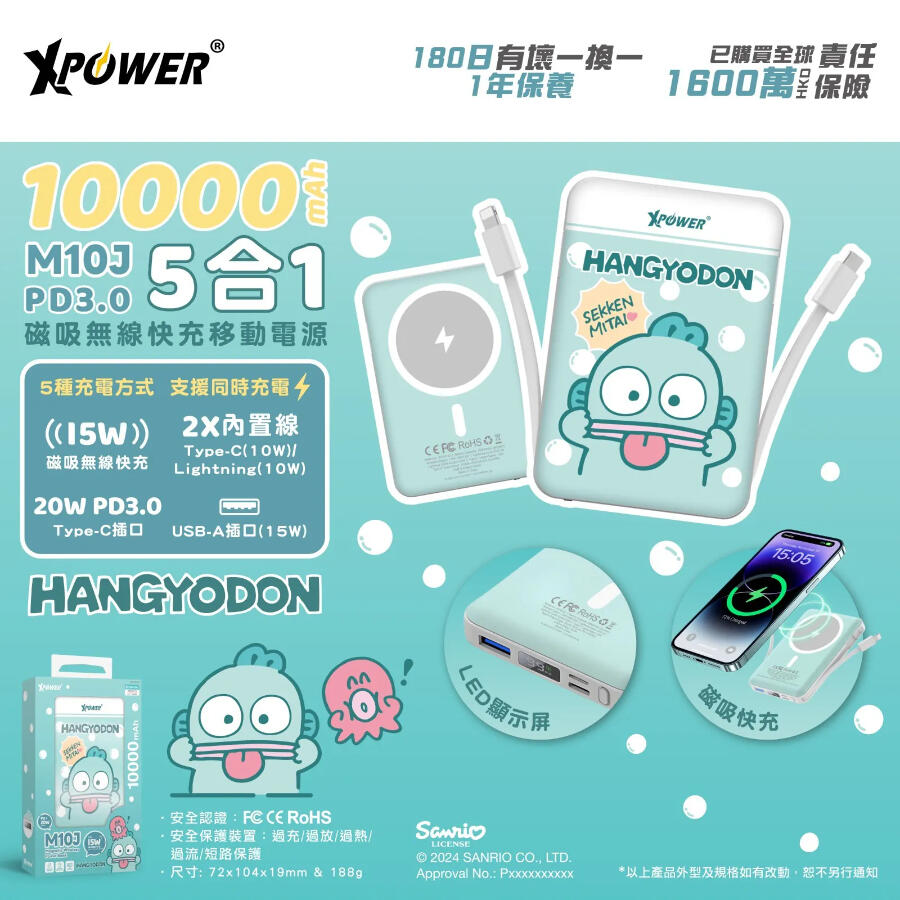 XPower x Sanrio Hangyodon 水怪 M10J 10000mAh 5合1磁吸無線行動電源