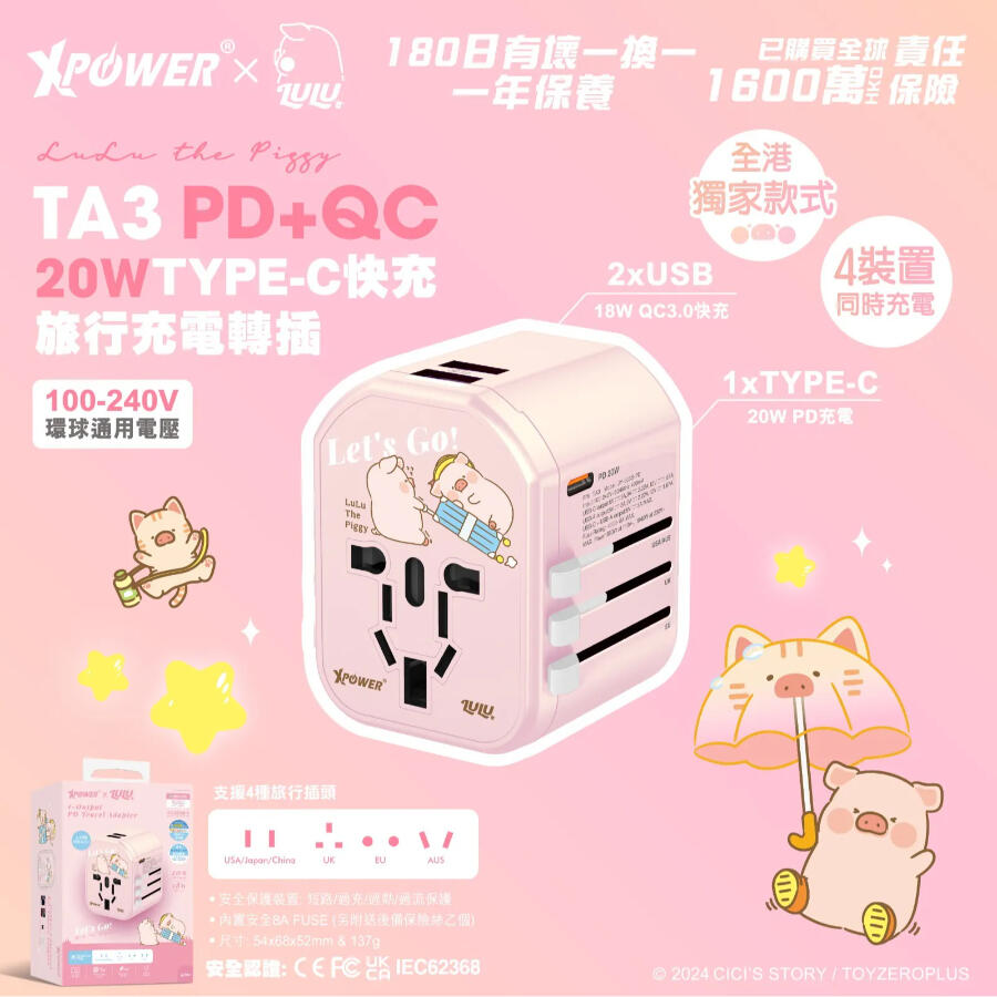 XPower x 罐頭豬LuLu TA3 20W Type C 快充旅行充電轉插