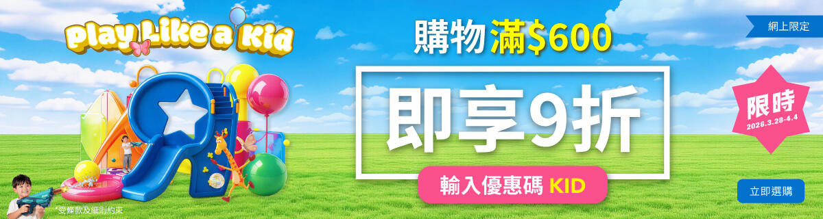 兒童節優惠 - 於付款前輸入優惠碼 “KID”,購物滿$600即享9折。
